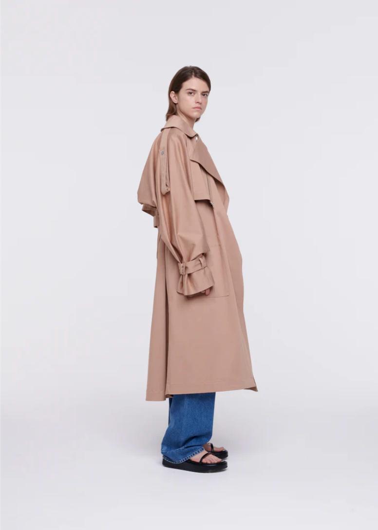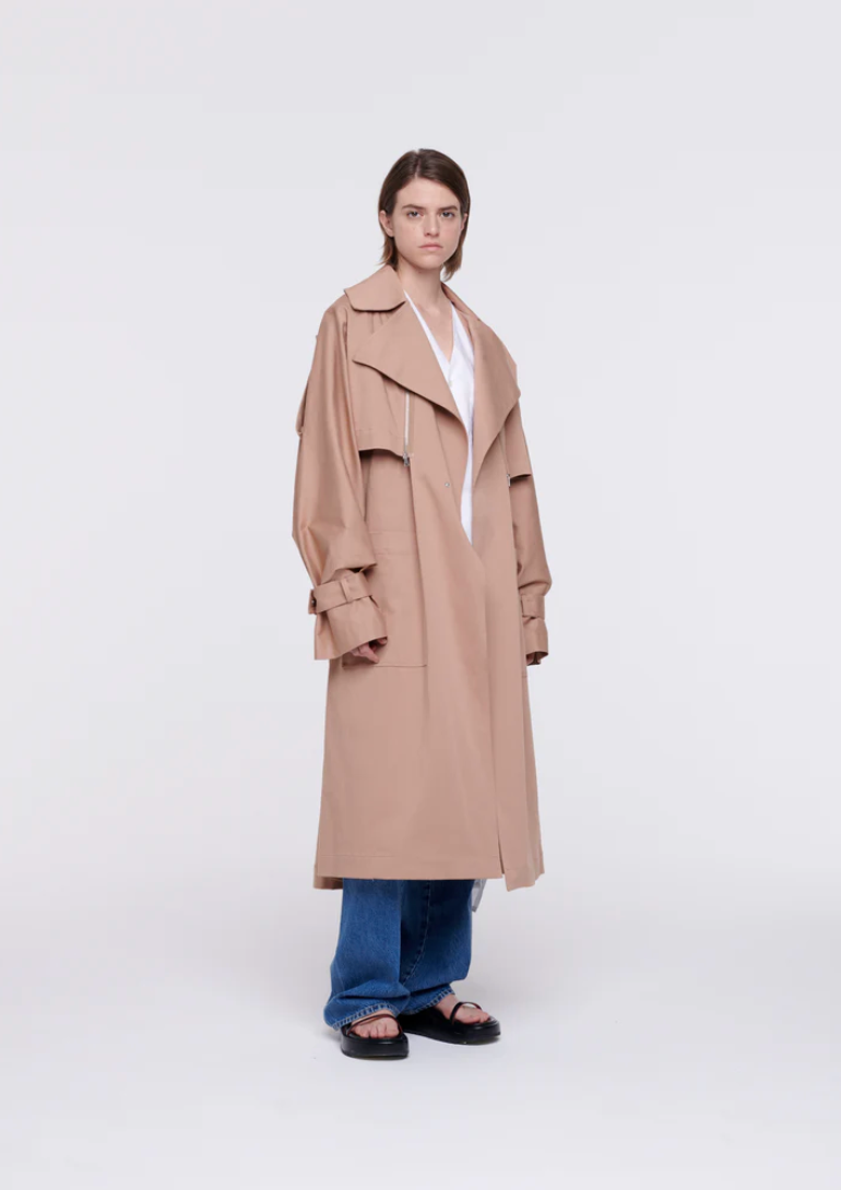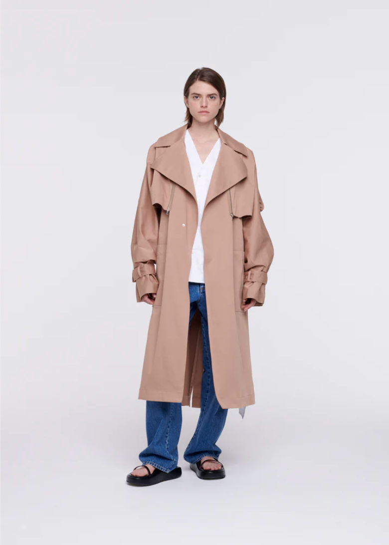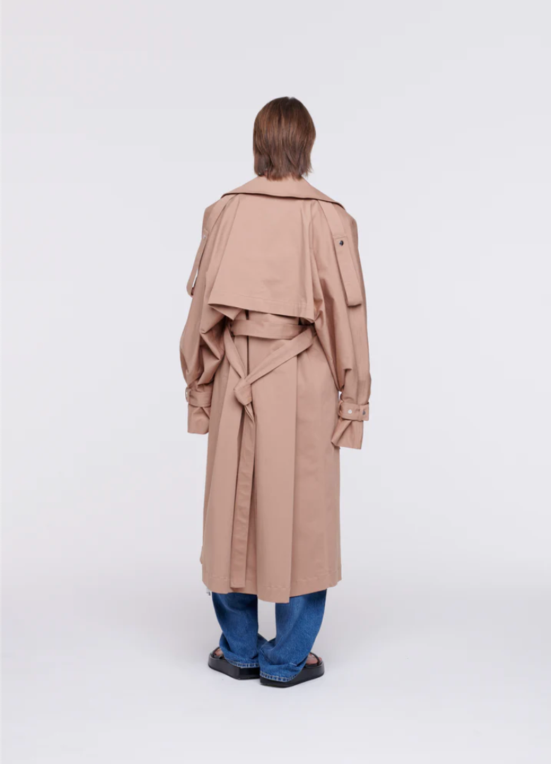 Mid-length cotton trench coat with belt.