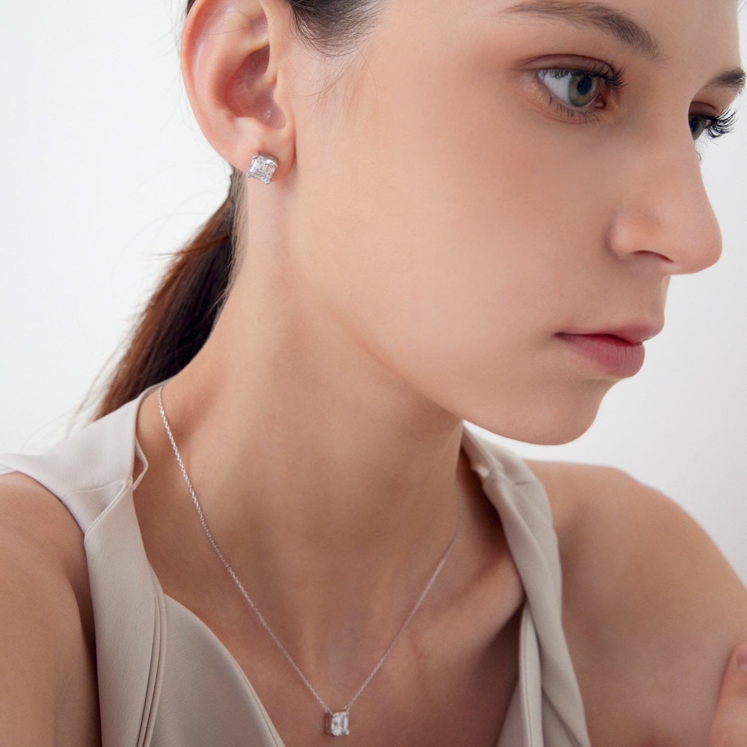 The Asscher-cut cubic zirconia is framed by square prongs aligned with its precise geometry, set low to highlight its refined, luminous quality. Finished in rhodium-plated 925 sterling silver.