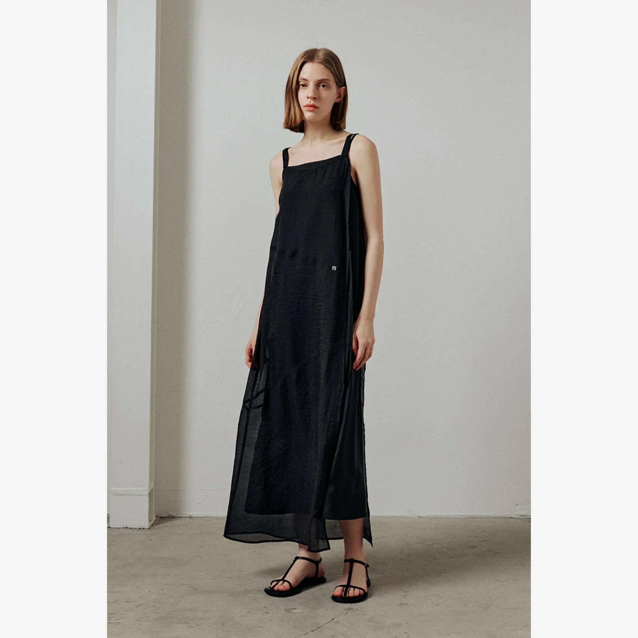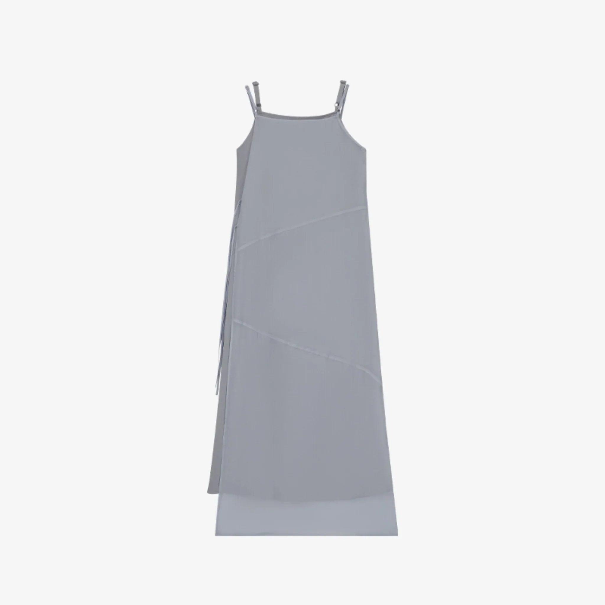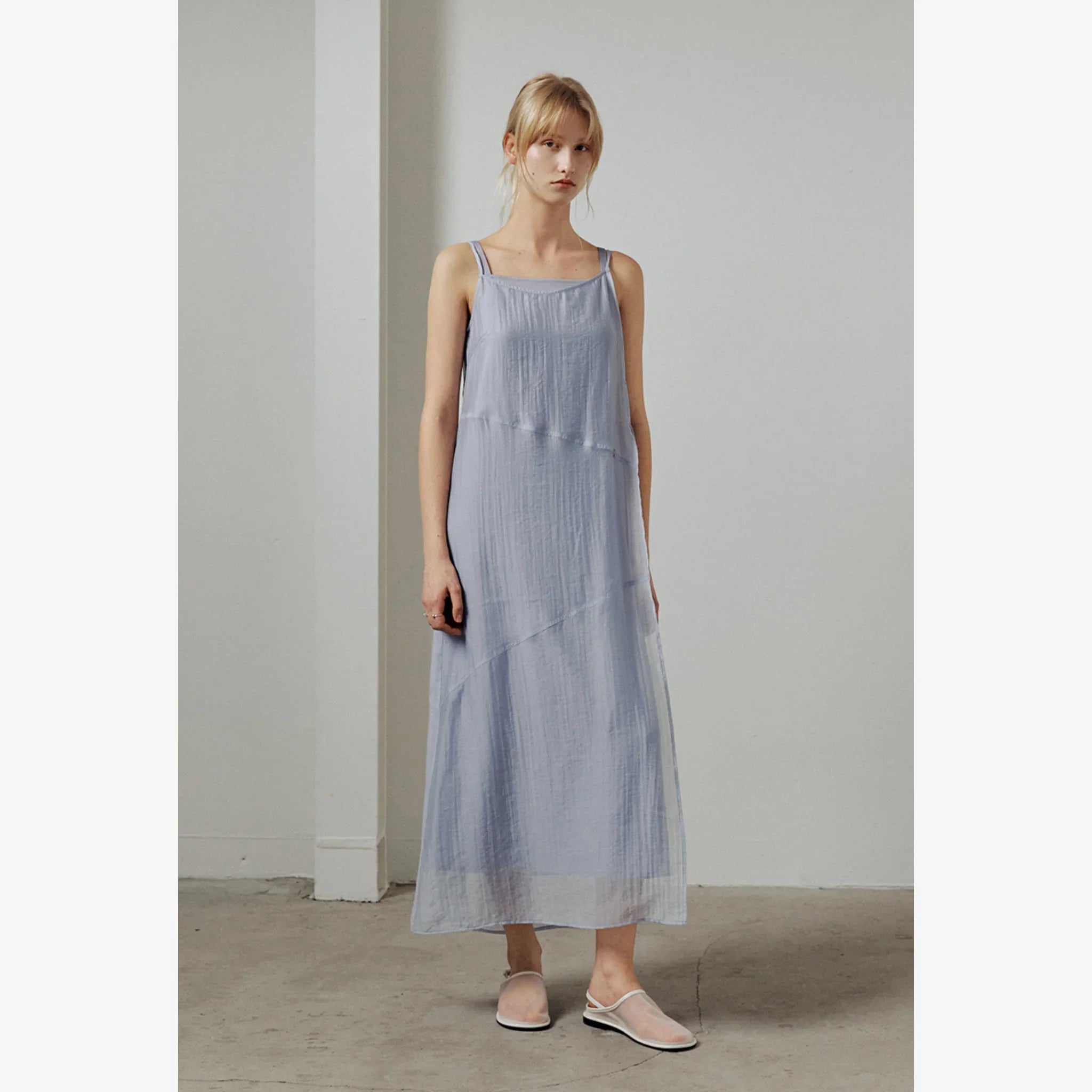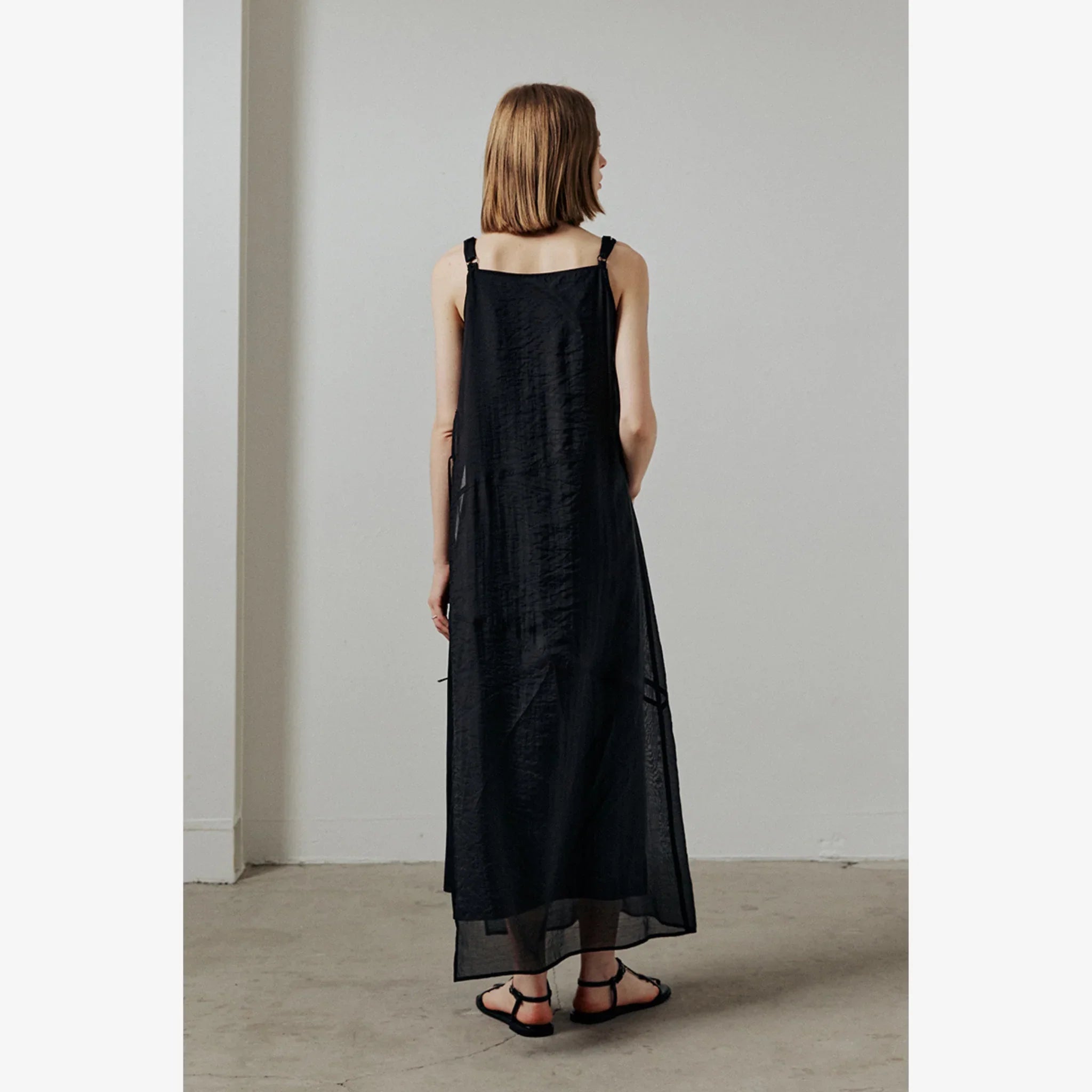 Layered sleeveless dress with a sheer outer layer and soft inner lining for a light, elegant look. Designed for adjustable fit and subtle detailing.