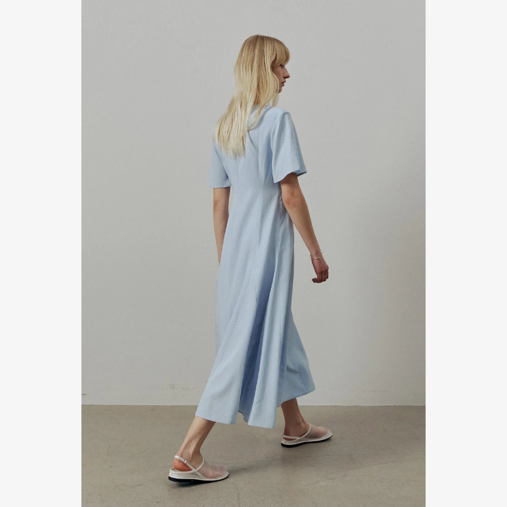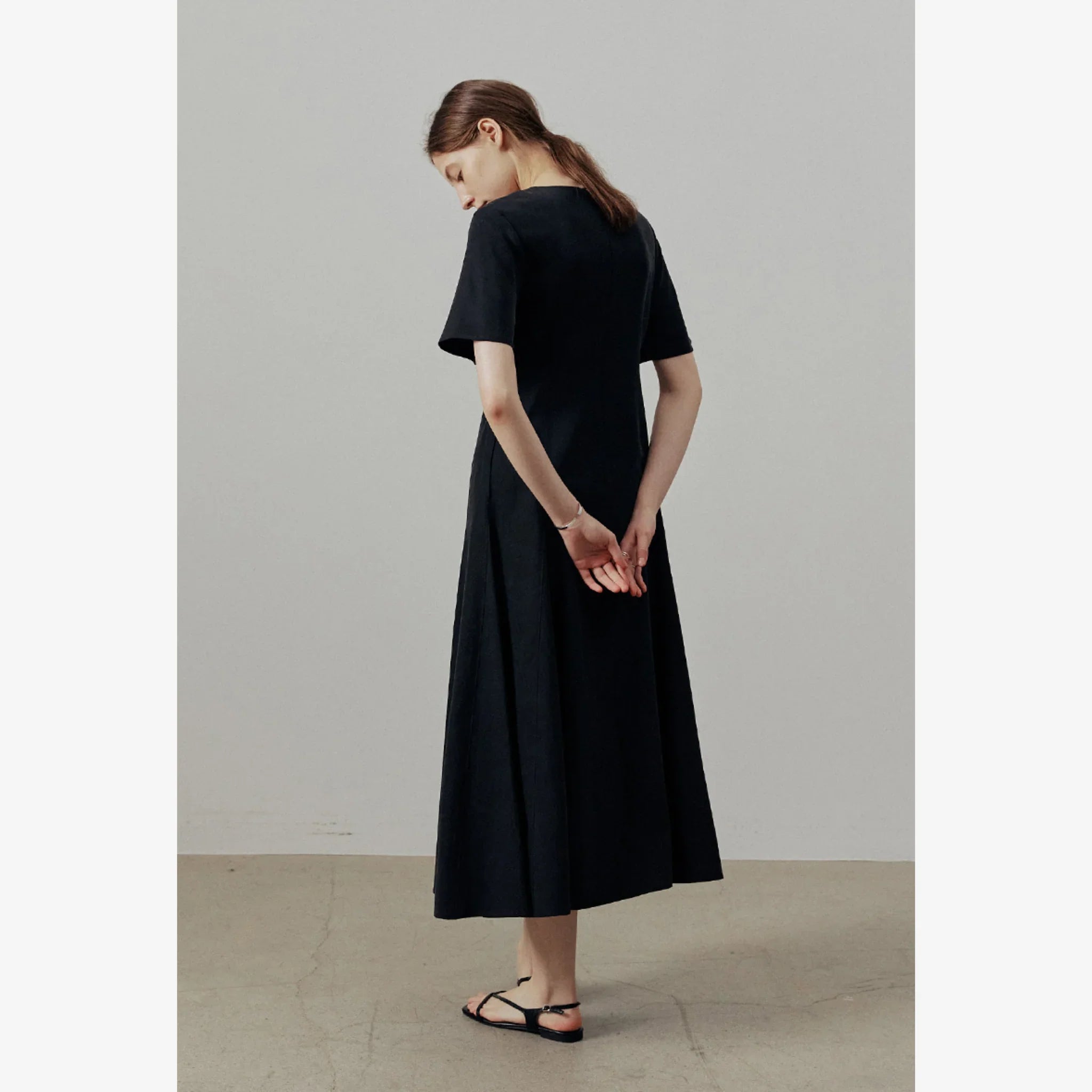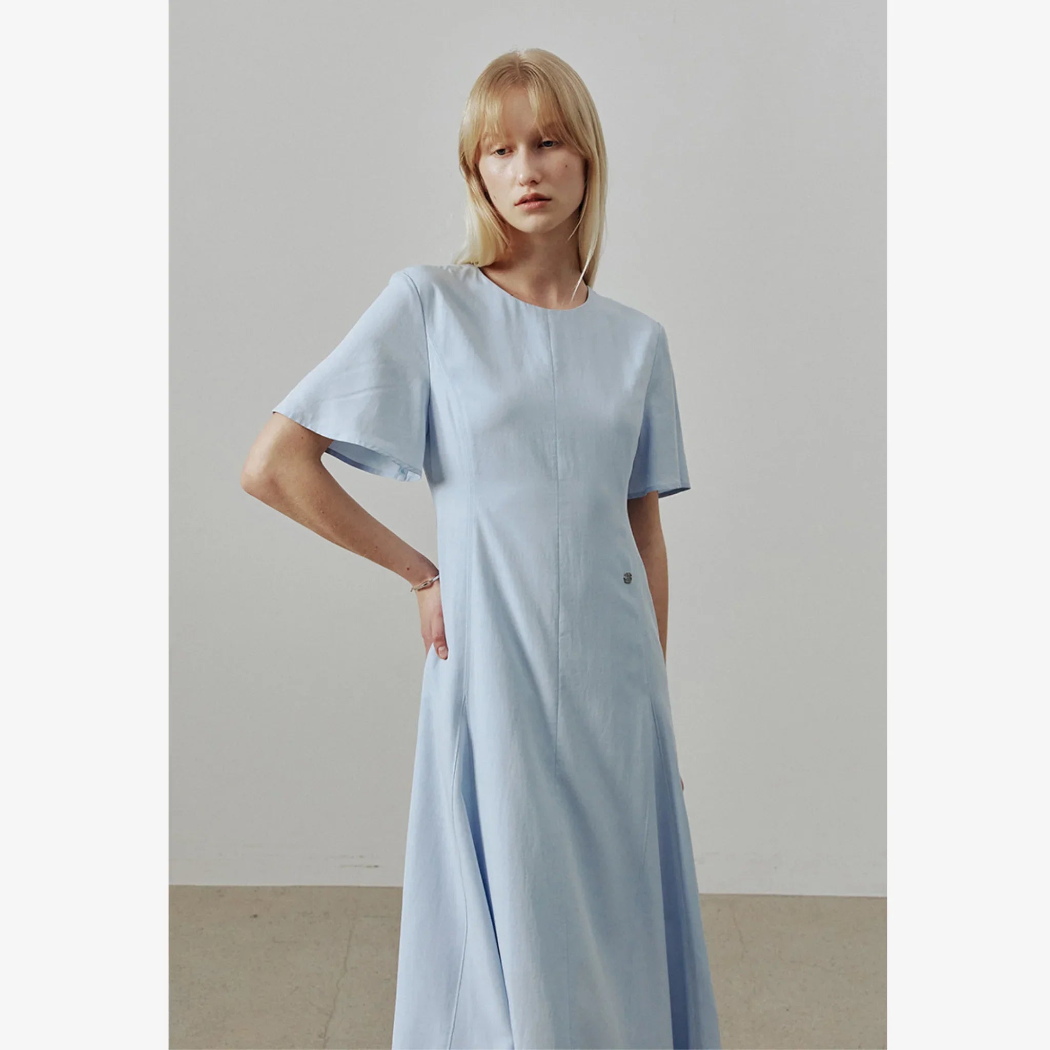 Lightweight linen-blend flare dress designed for a refined, feminine look with a comfortable fit.