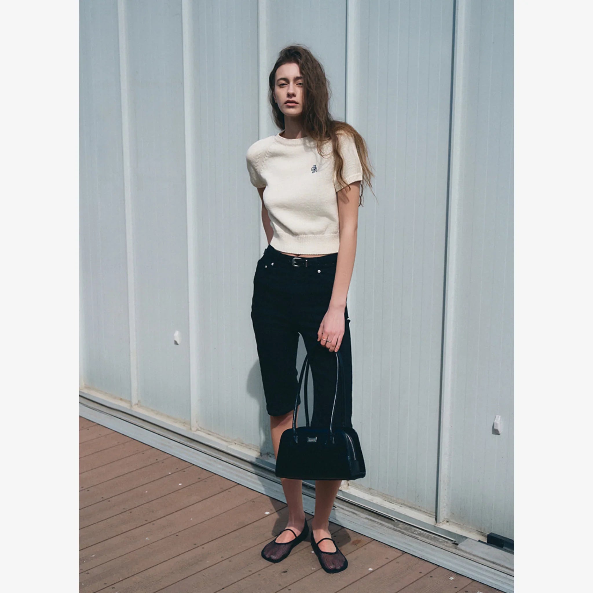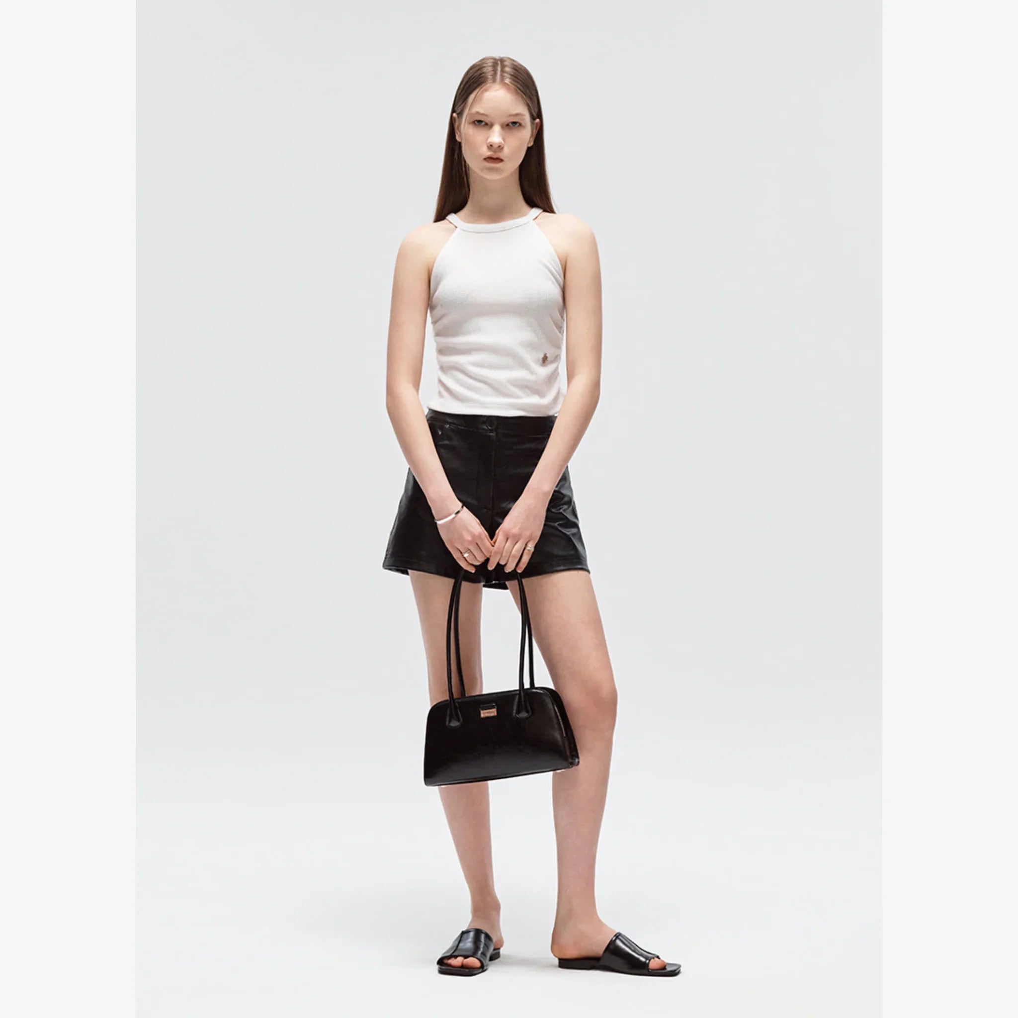 Trapezoid silhouette with metallic logo detail