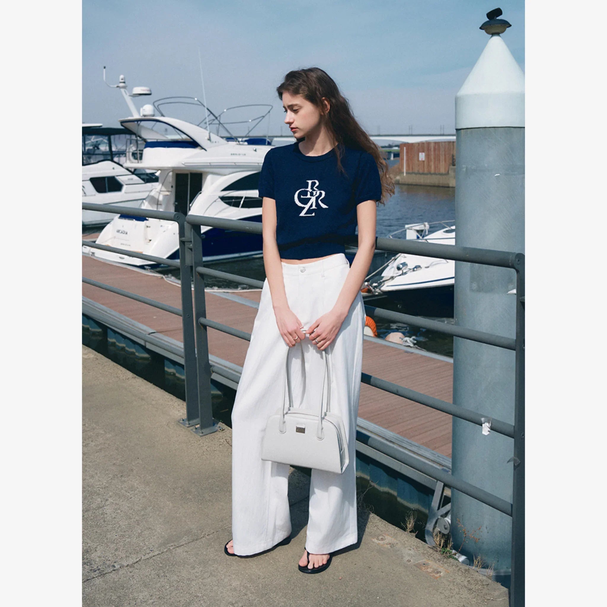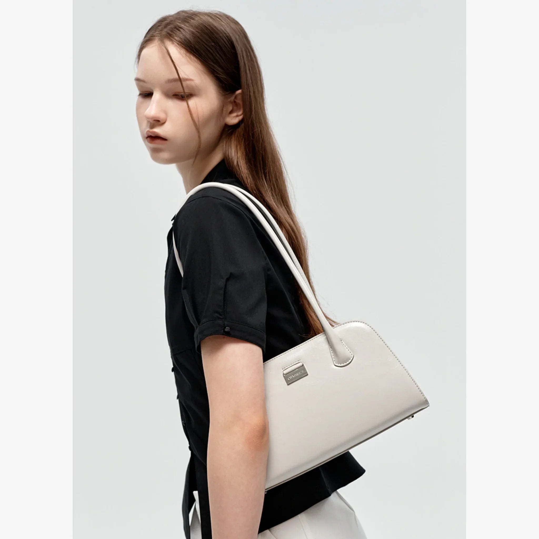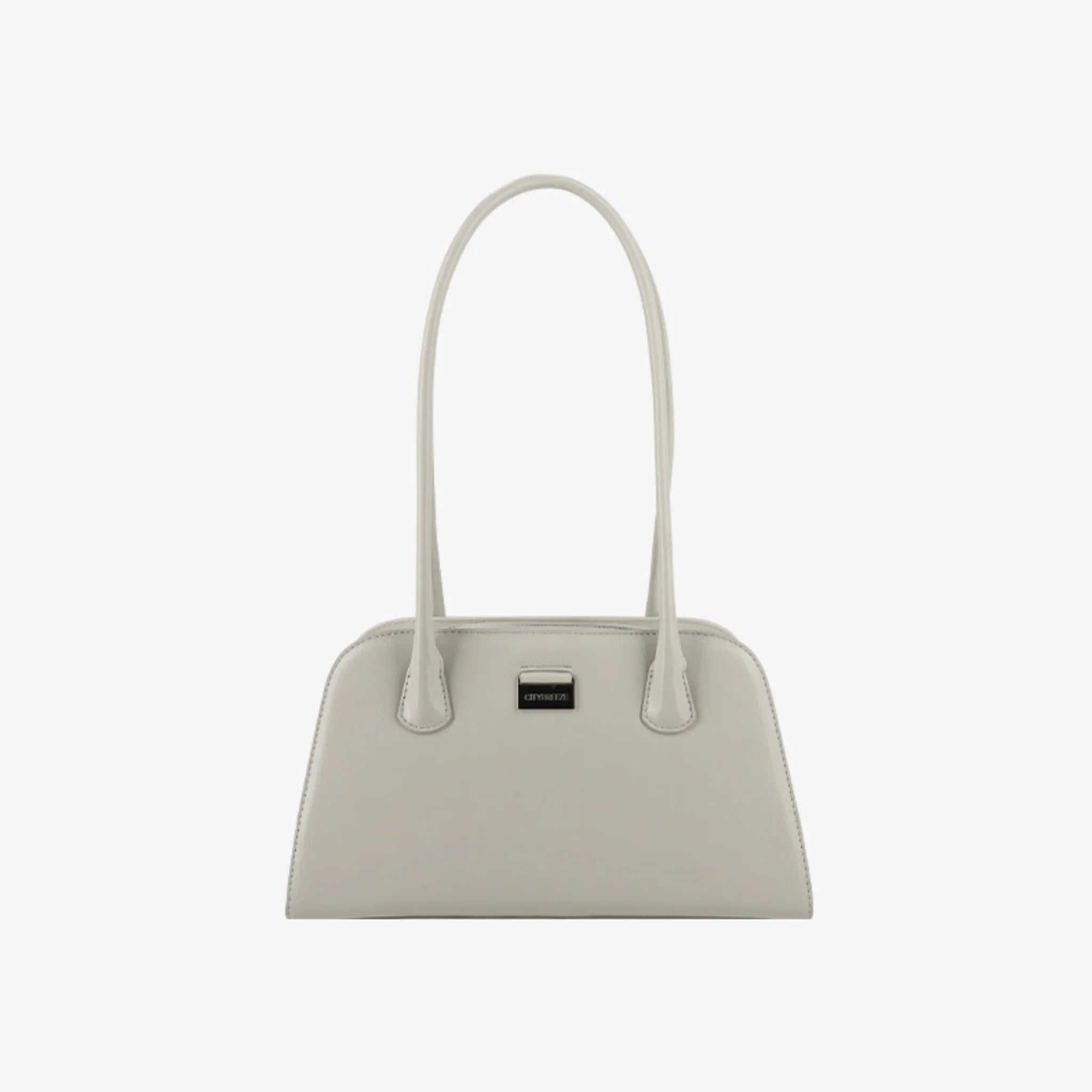 City trapezoid shoulder bag featuring a metallic Citybreeze logo accent. Designed with a zip closure for secure and spacious storage, and equipped with metal feet at the base to protect the bag when placed down.