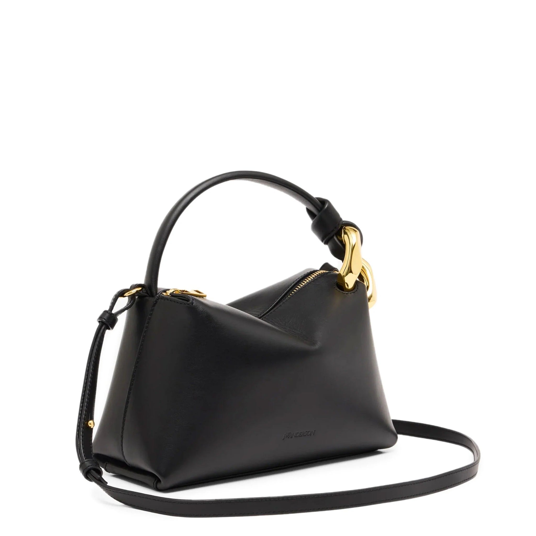 Leather cross-body Corner bag with signature gold chain link and decorative chunky contrast yellow stitching.