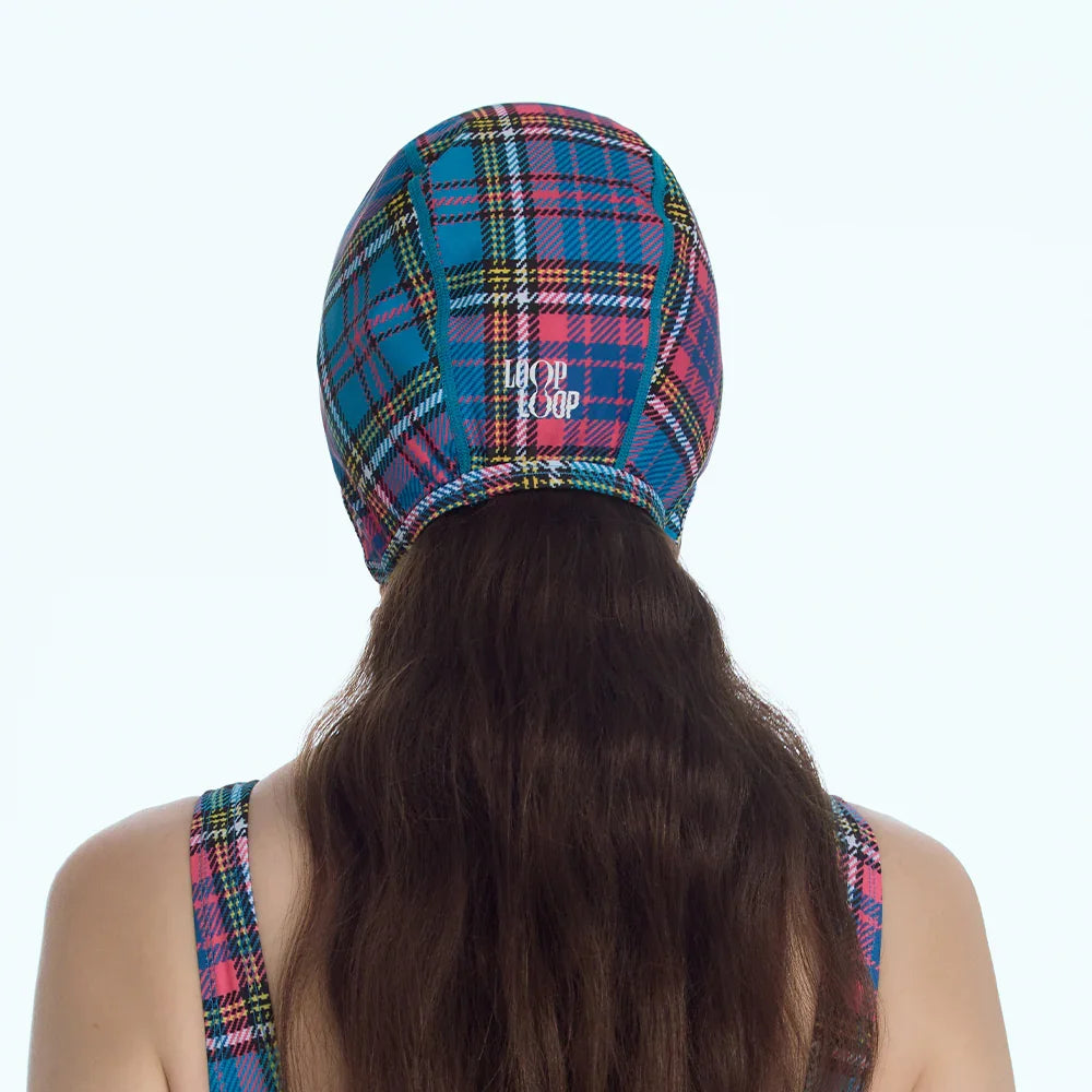 Retro-inspired swim cap in a preppy blue check pattern, blending playful design with a secure fit.