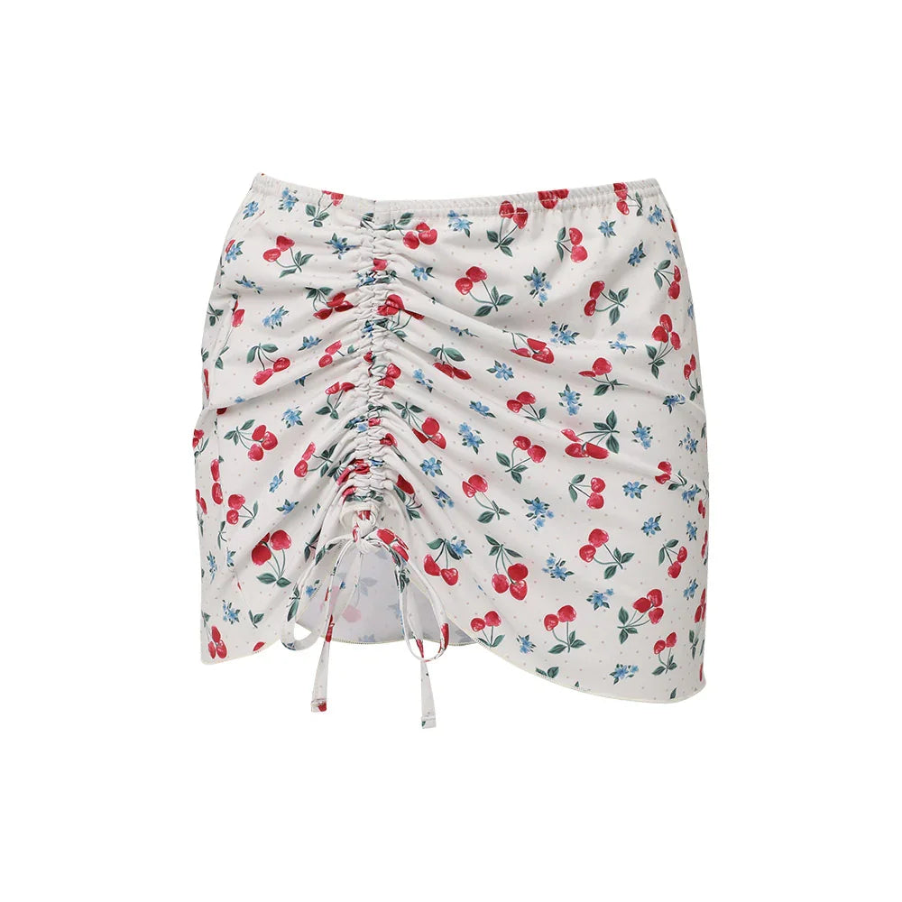 Playful cover-up skirt in an ivory cherry bomb print, designed with shirring detail and adjustable tie for a flattering beach-to-street look.