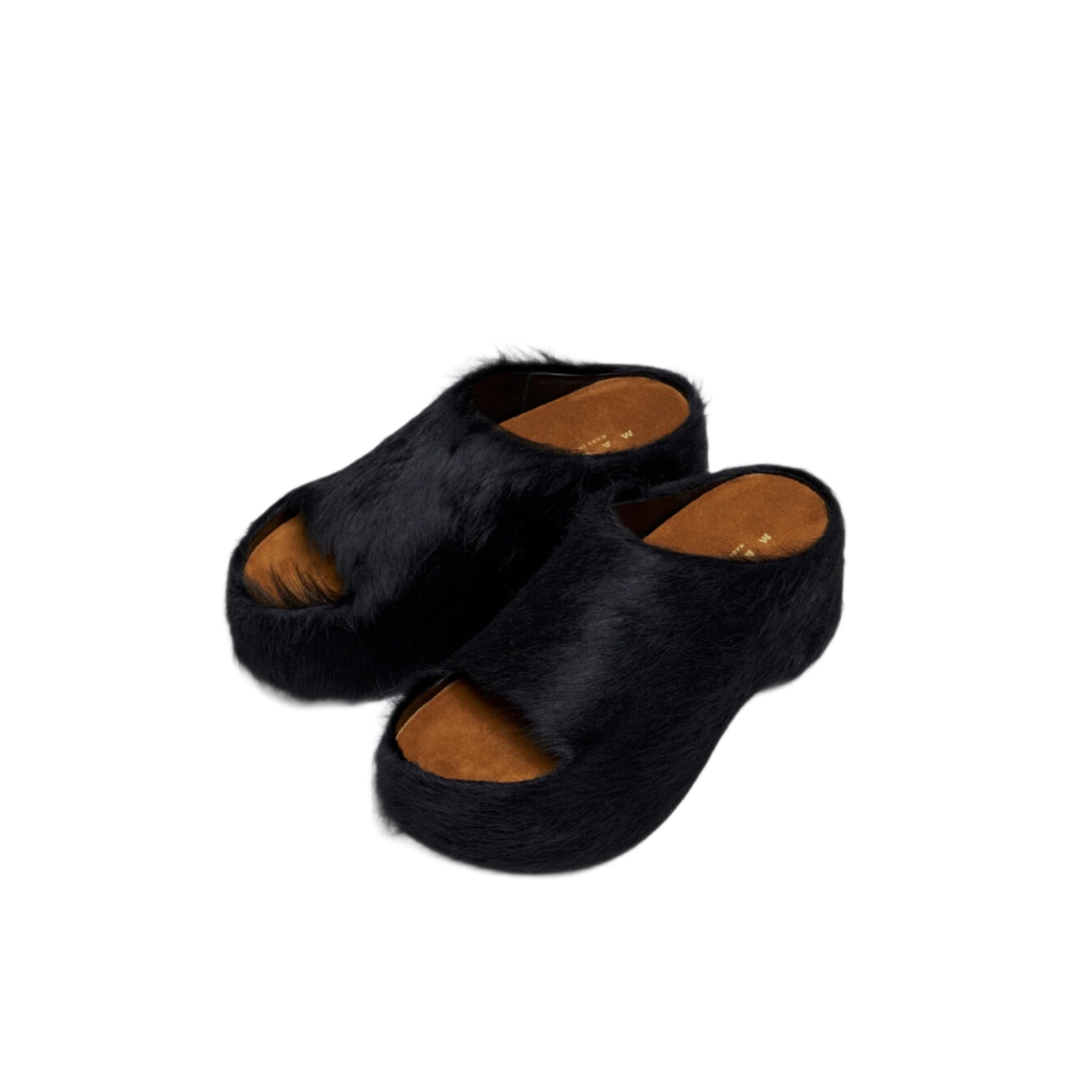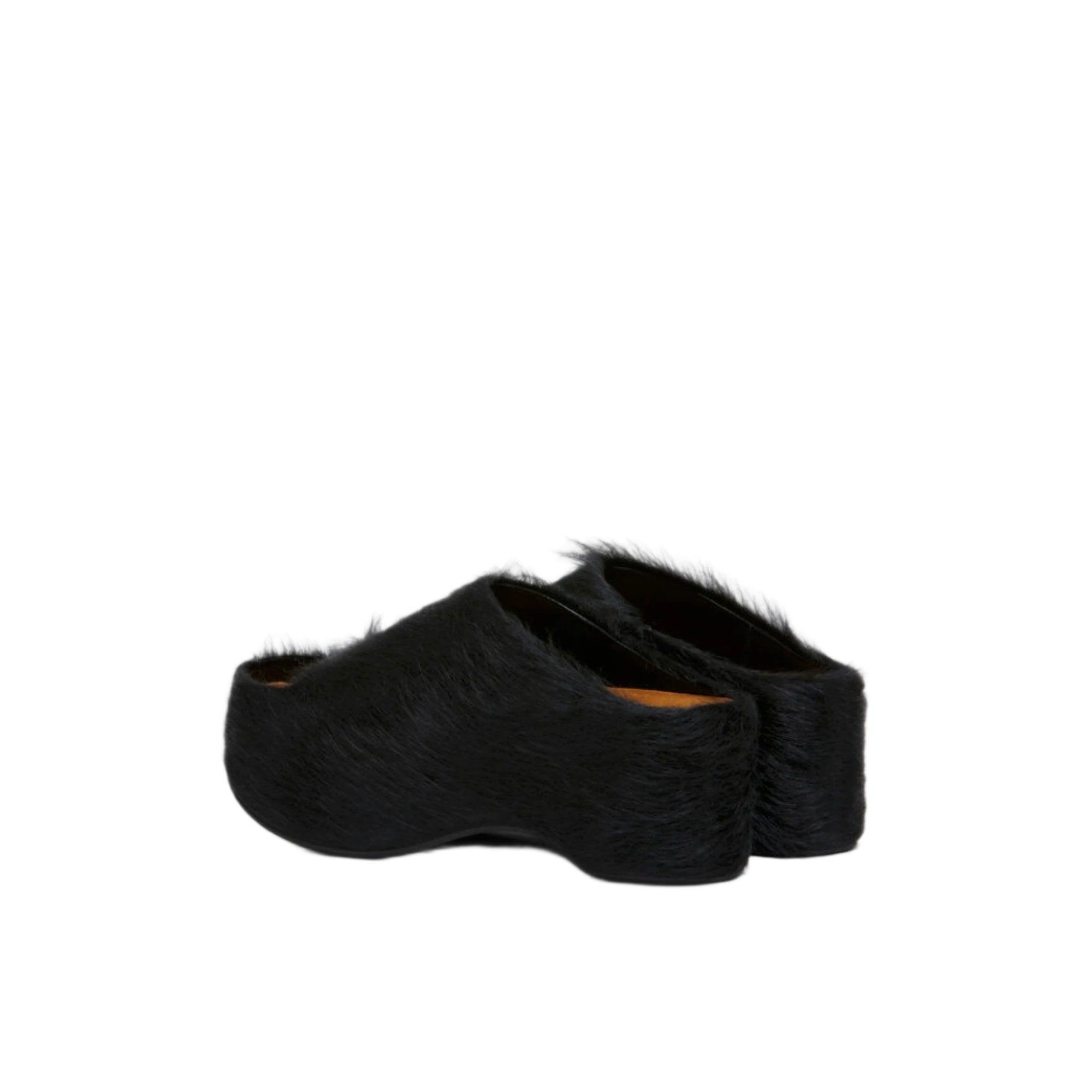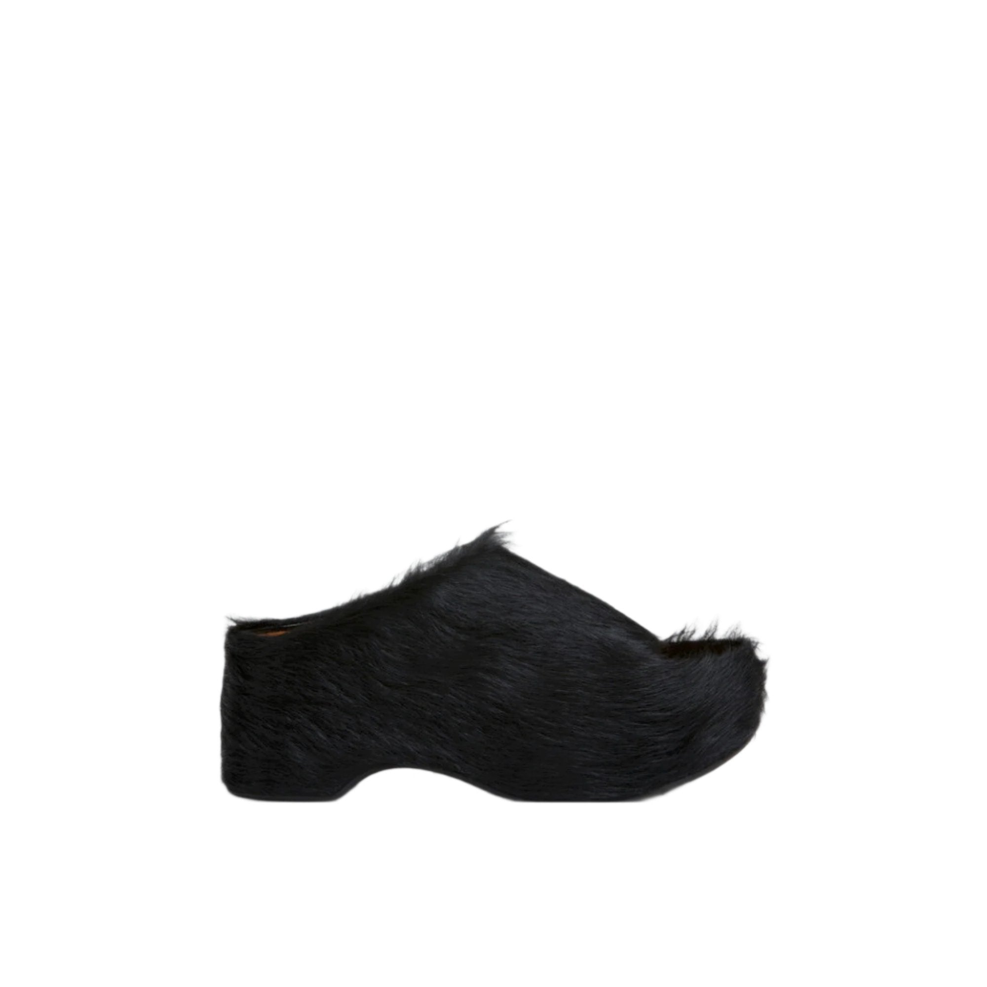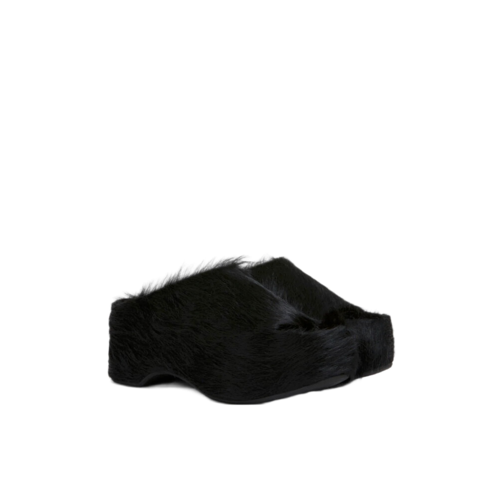 Black long-hair calfskin chunky clog slides.