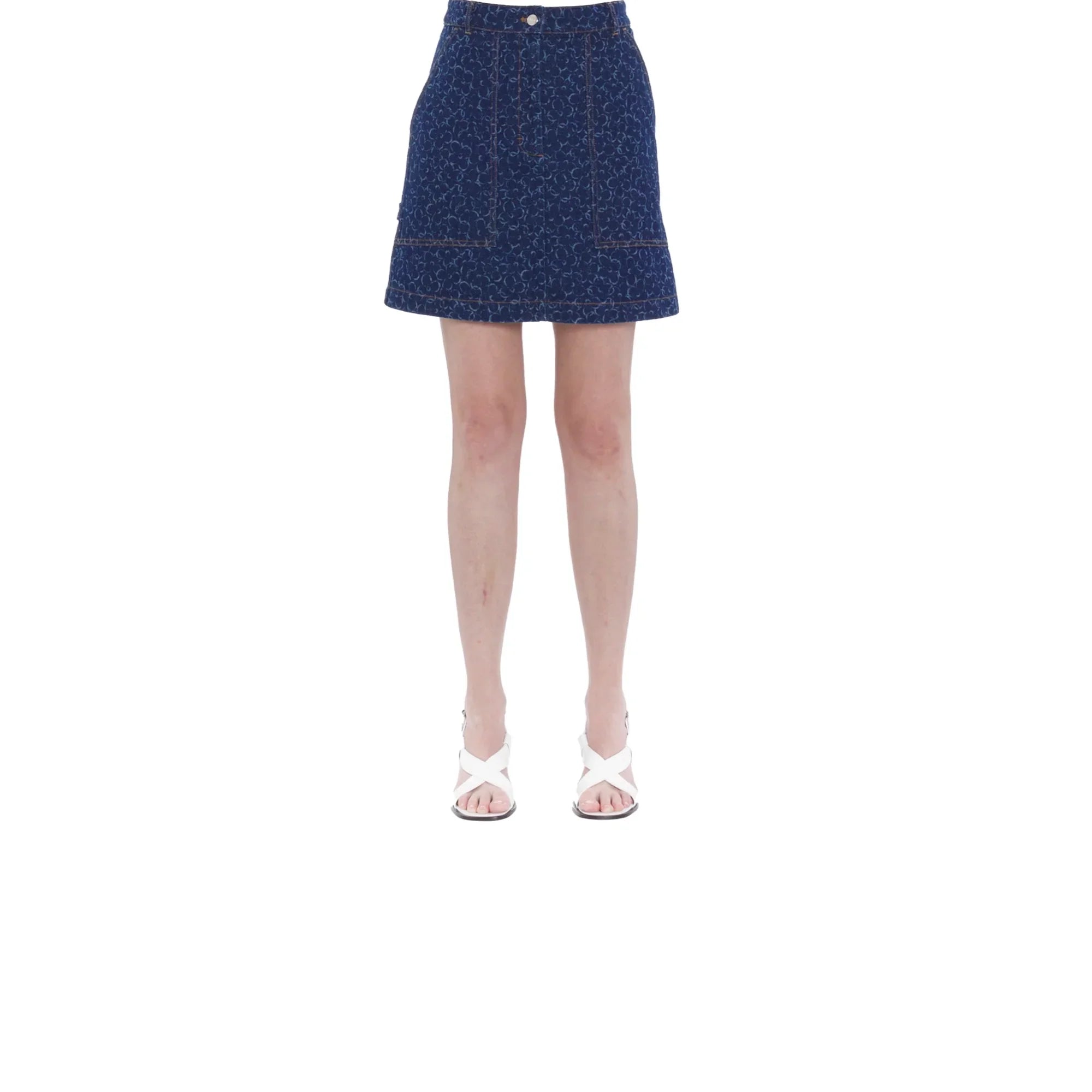 Non-stretch denim skirt. Laser-printed graphic pattern throughout.