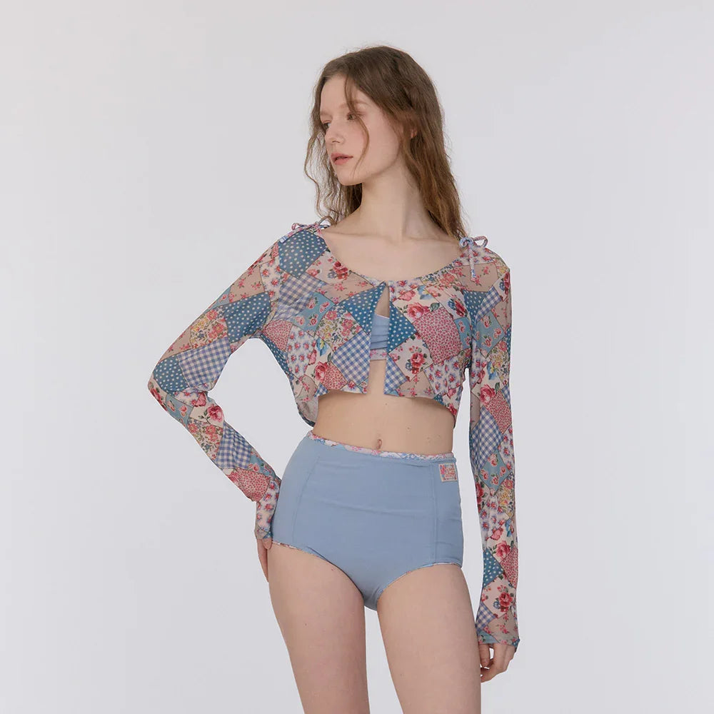 Mesh cropped cardigan in a bohemian patchwork sky blue print, perfect as a lightweight cover-up that adds a playful yet chic touch to any swim look.