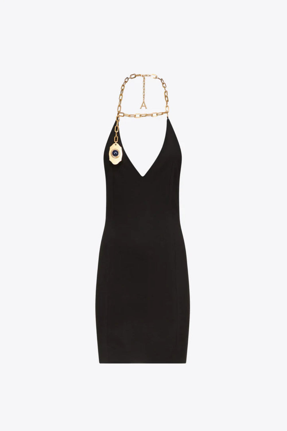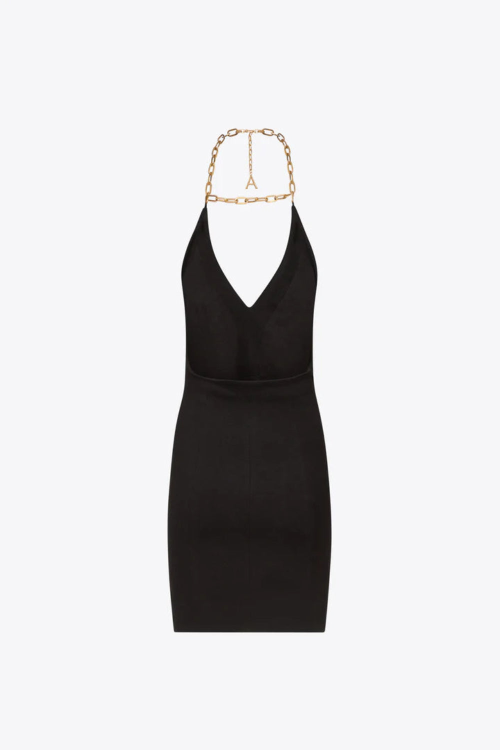 A bold halter neckline adorned with metallic chain plates for a striking, modern look.