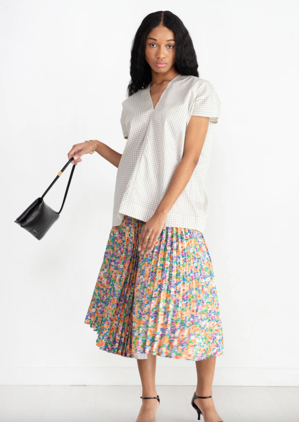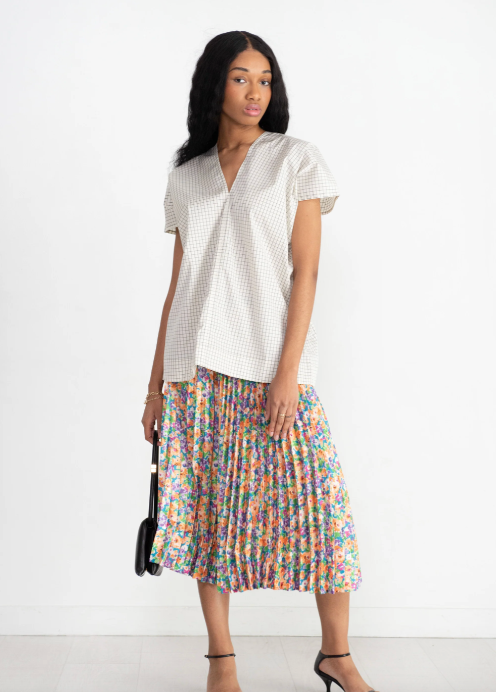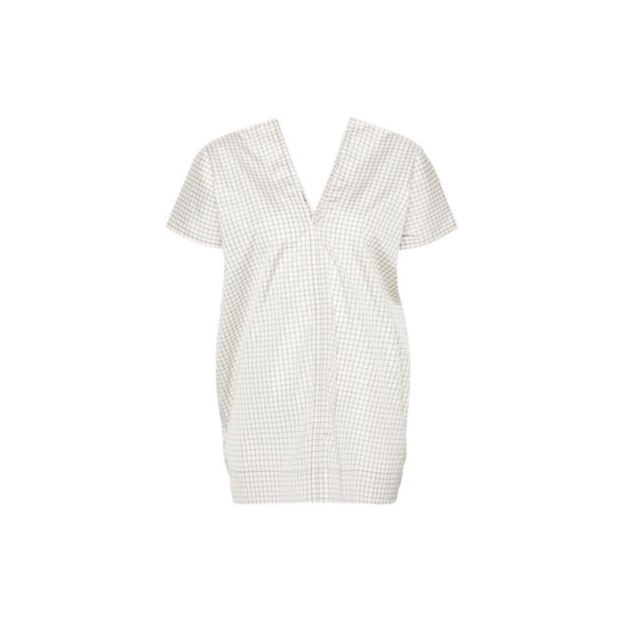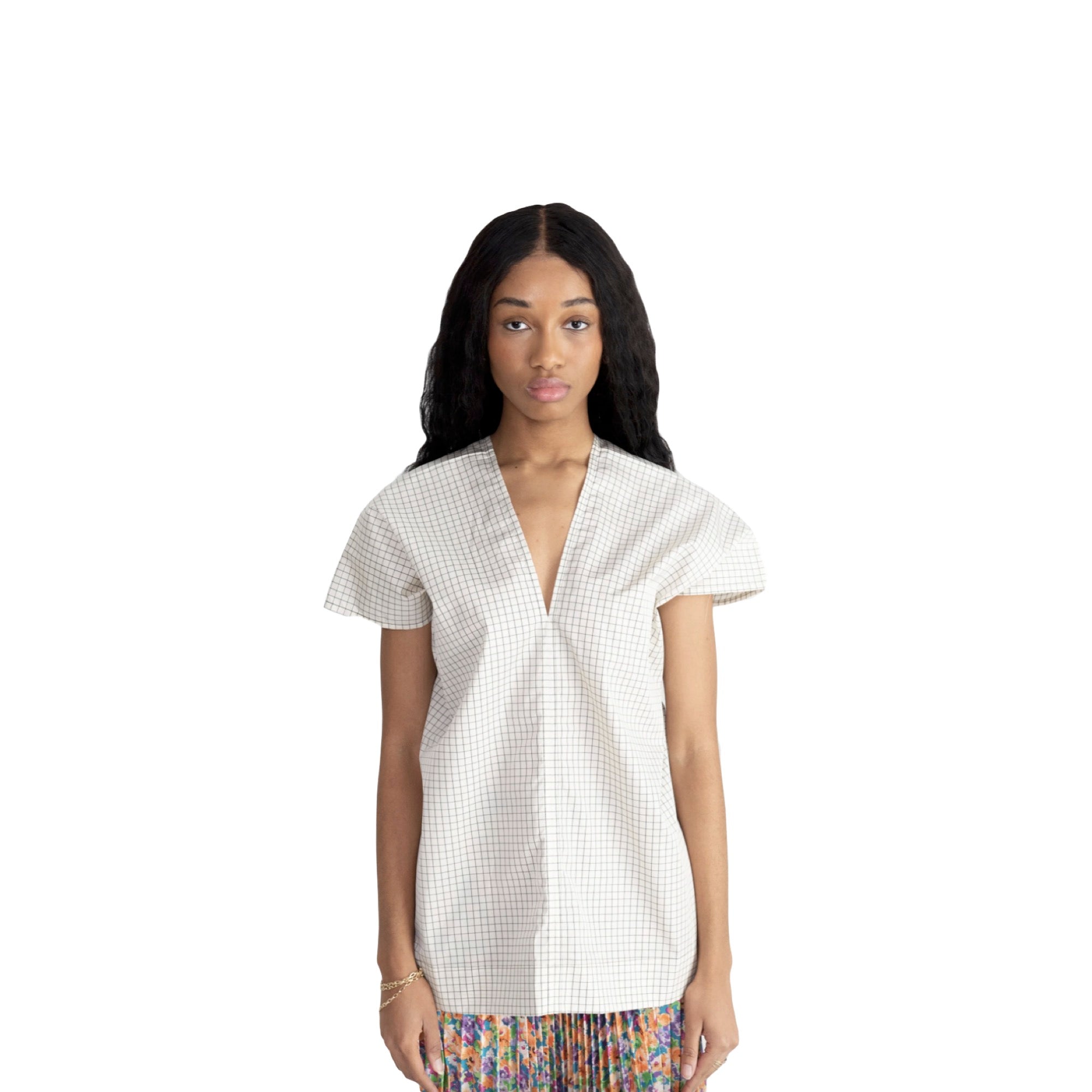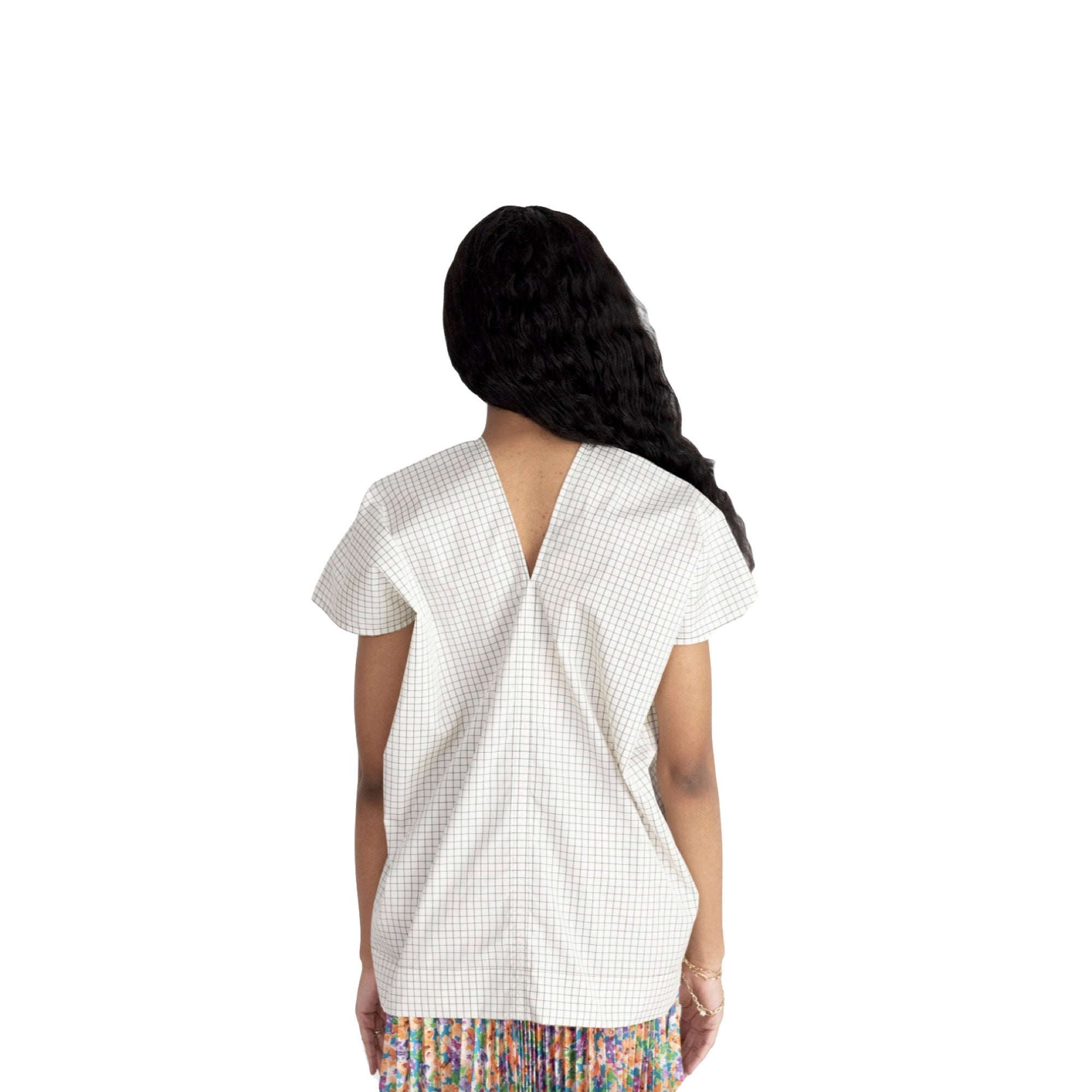 앞과 뒤에 V넥 칼라가 달린 흰색 체크 무늬의 짧은 소매 상의입니다.