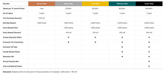 Our loyalty program features five tiers, each offering increasing perks and rewards based on your cumulative purchase amounts: