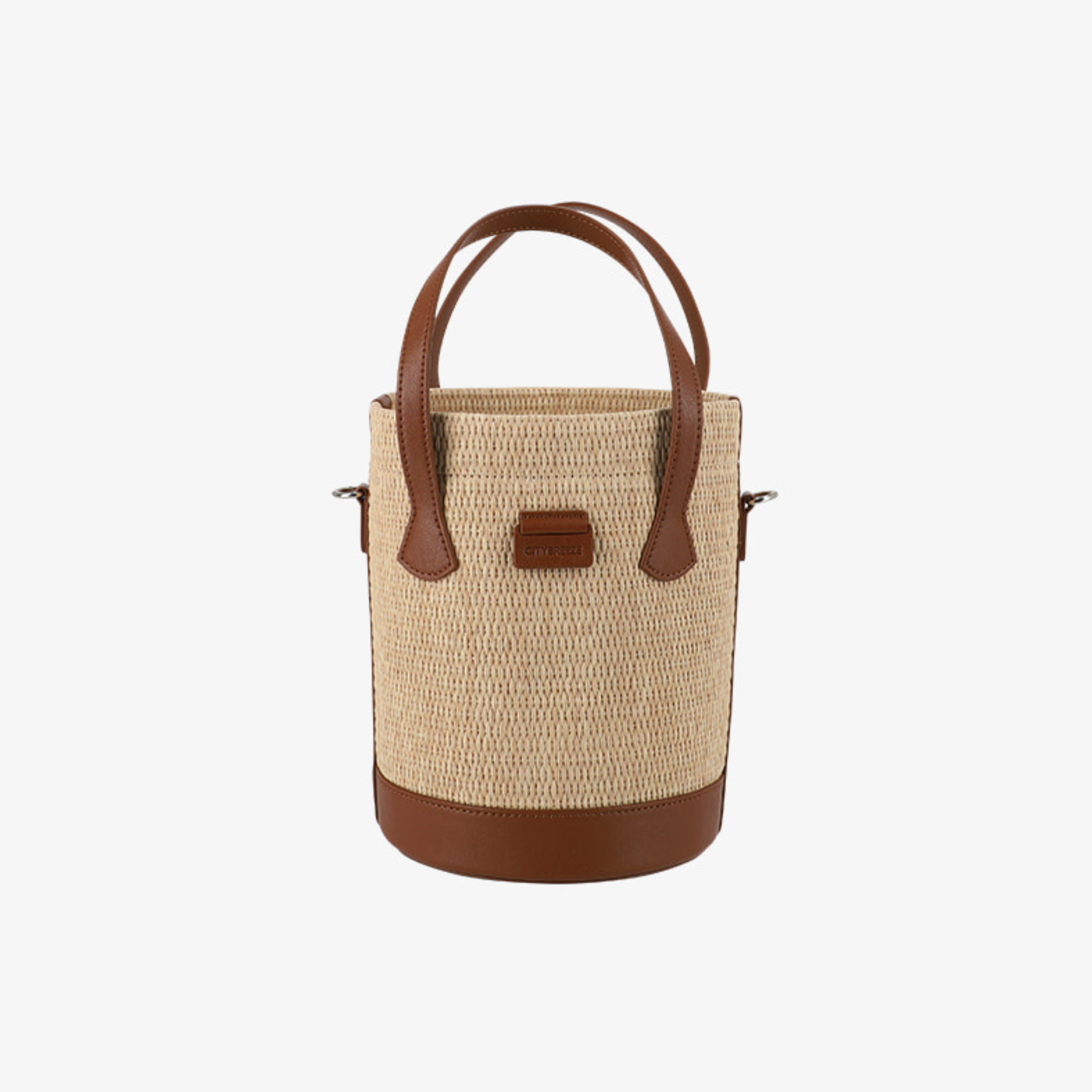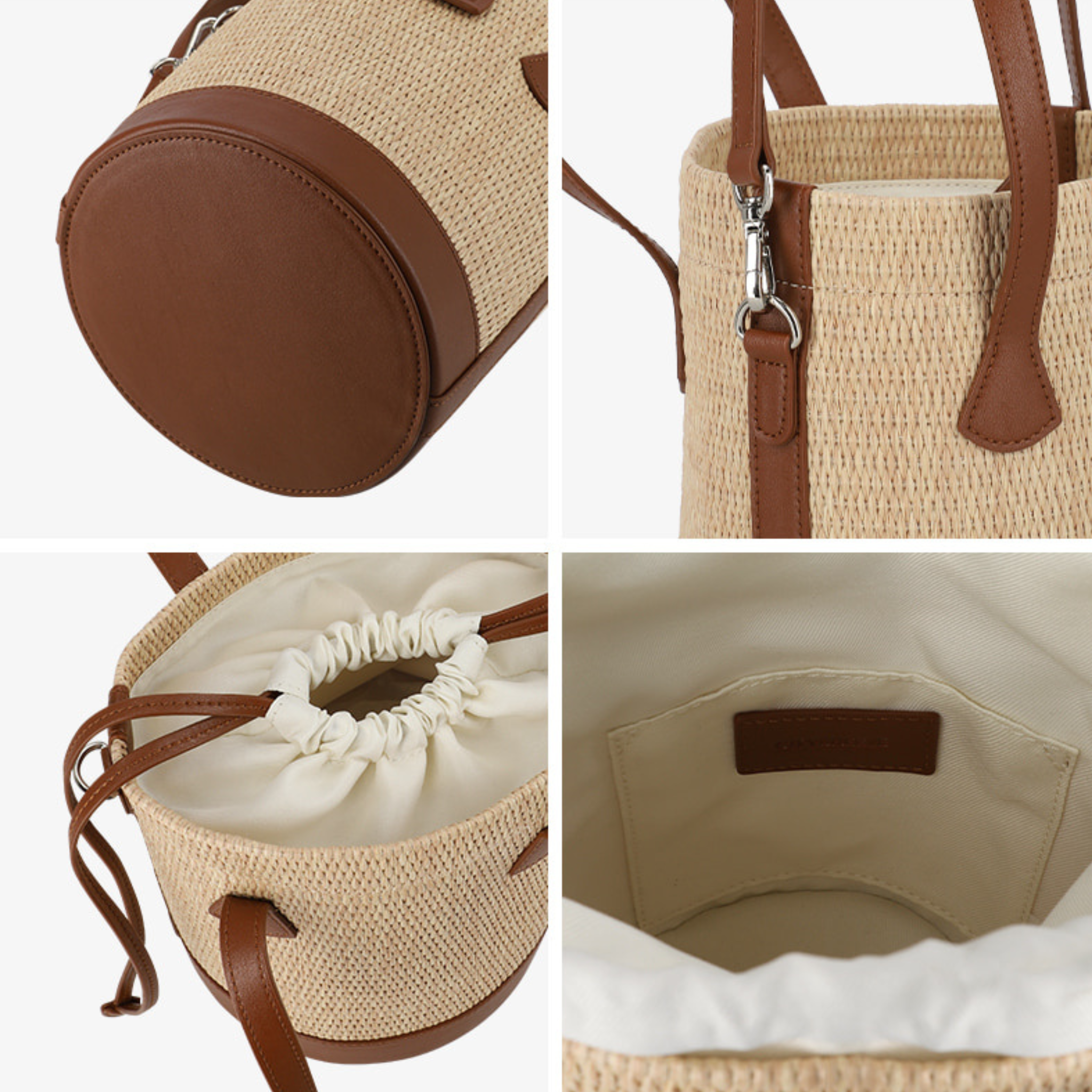 City raffia basket shoulder bag combining raffia material with synthetic leather accents. Features a fixed drawstring inner pouch for secure closure, and an adjustable, detachable strap for versatile 3-way styling as a tote, shoulder, or crossbody bag.