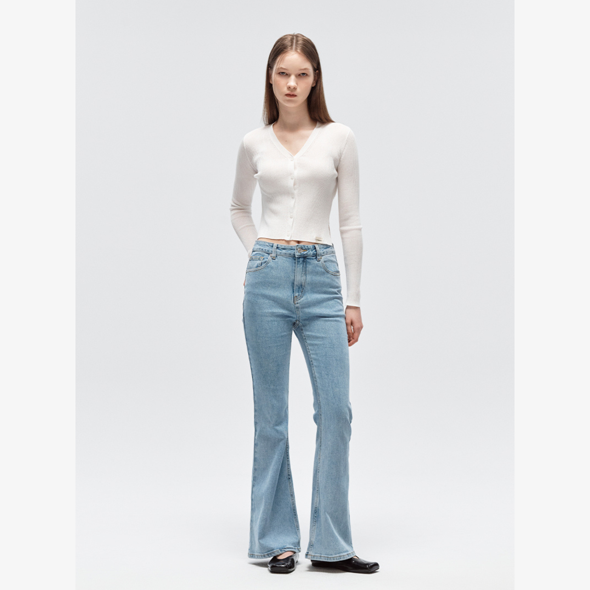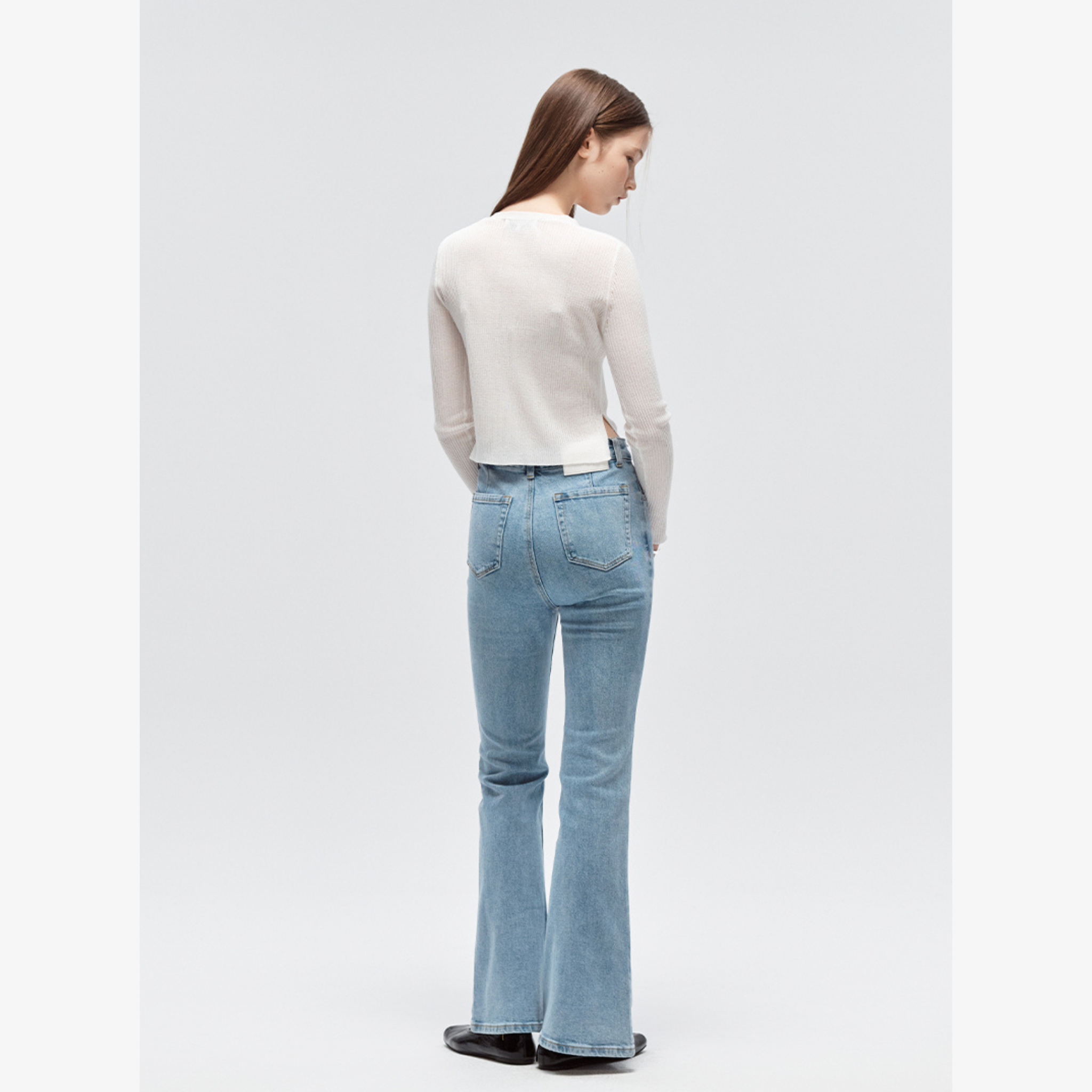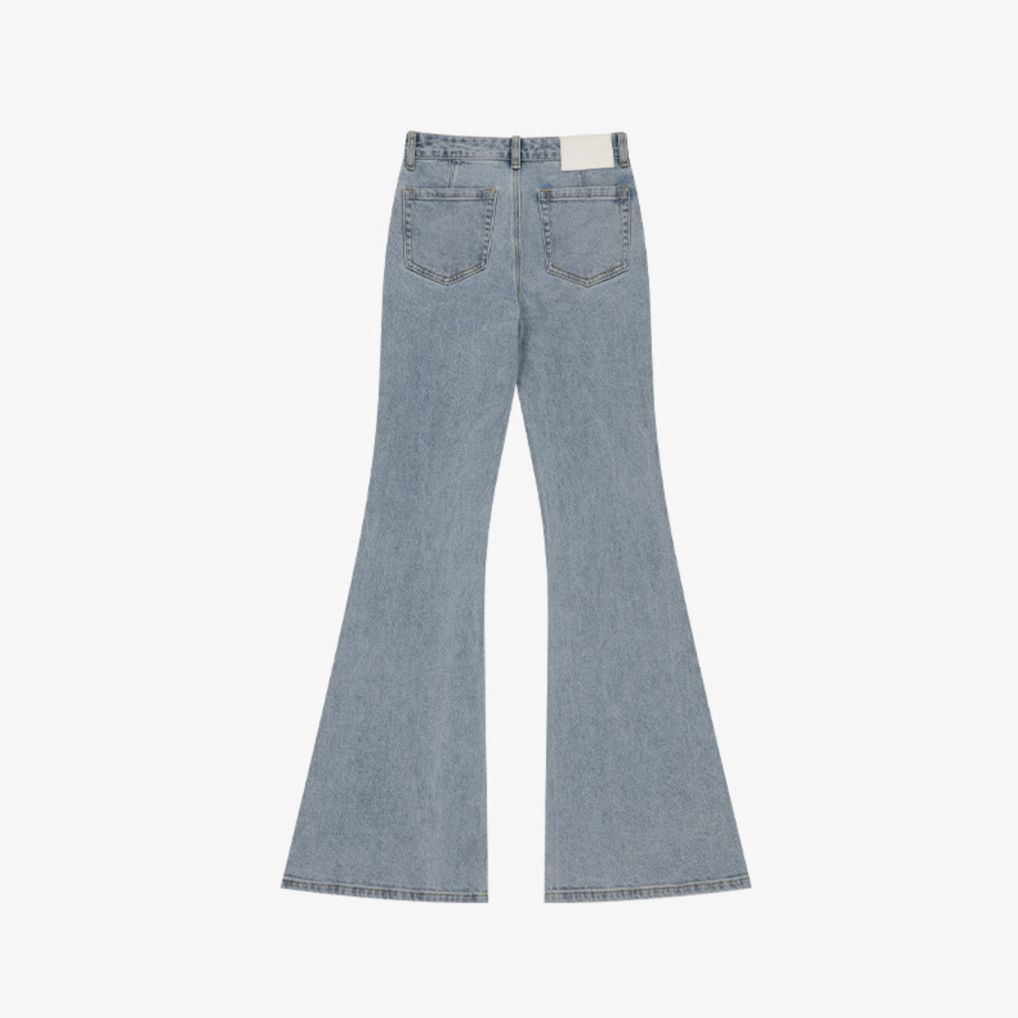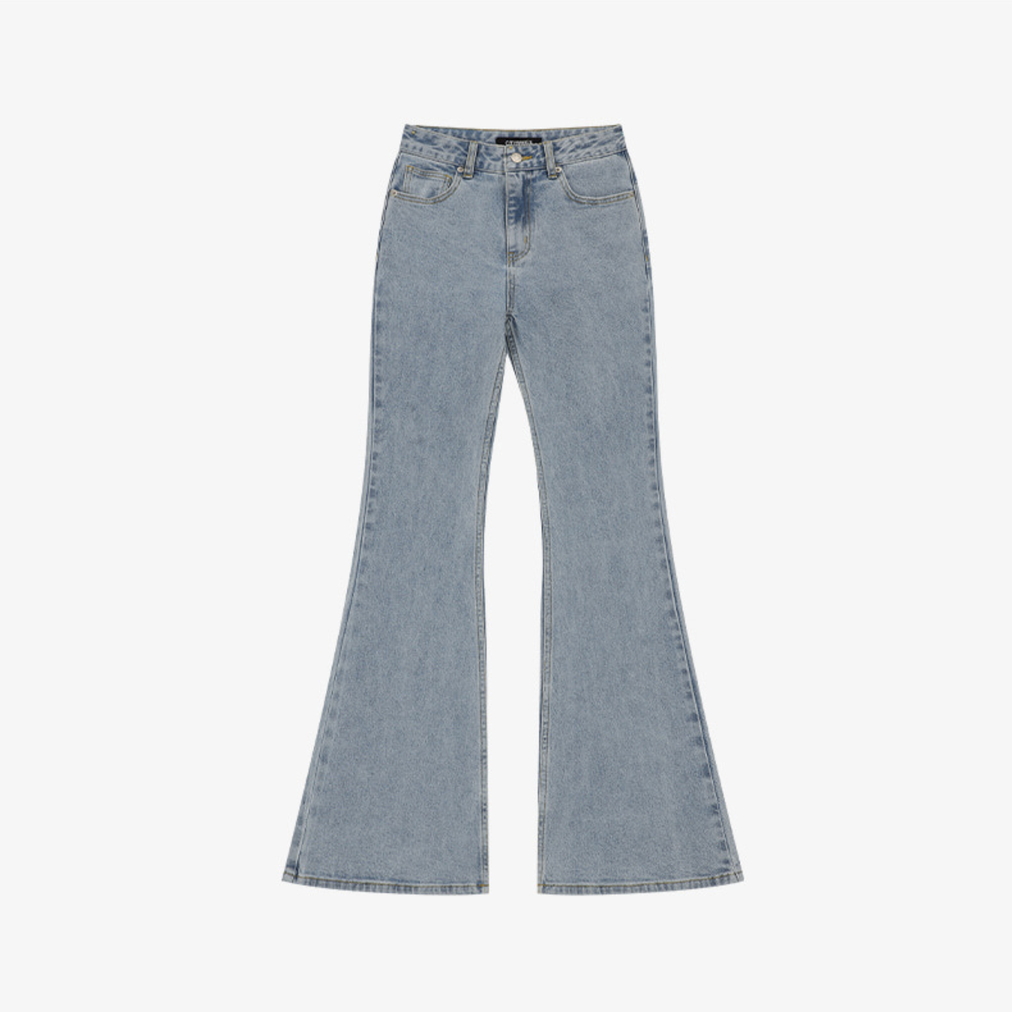 Flare denim pants in a light blue wash, crafted from stretch fabric for comfortable wear. Designed with a fitted waist and thigh, flaring out toward the hem for a flattering silhouette.
