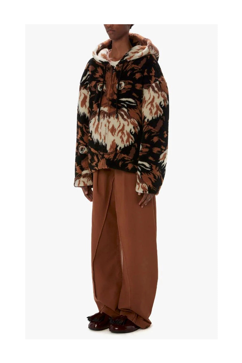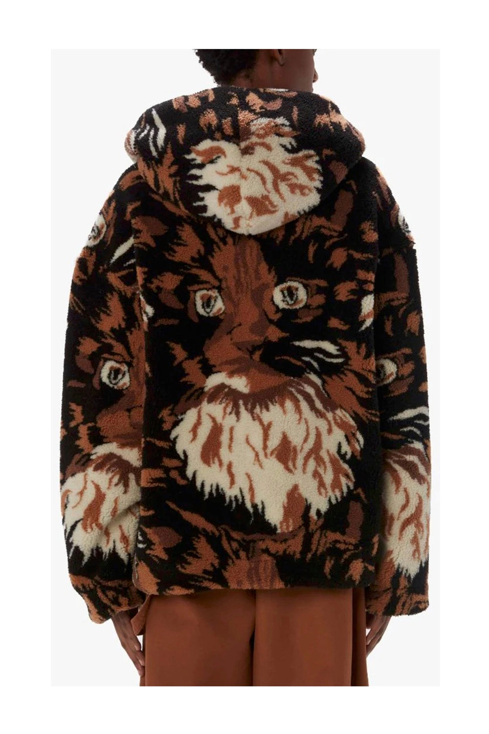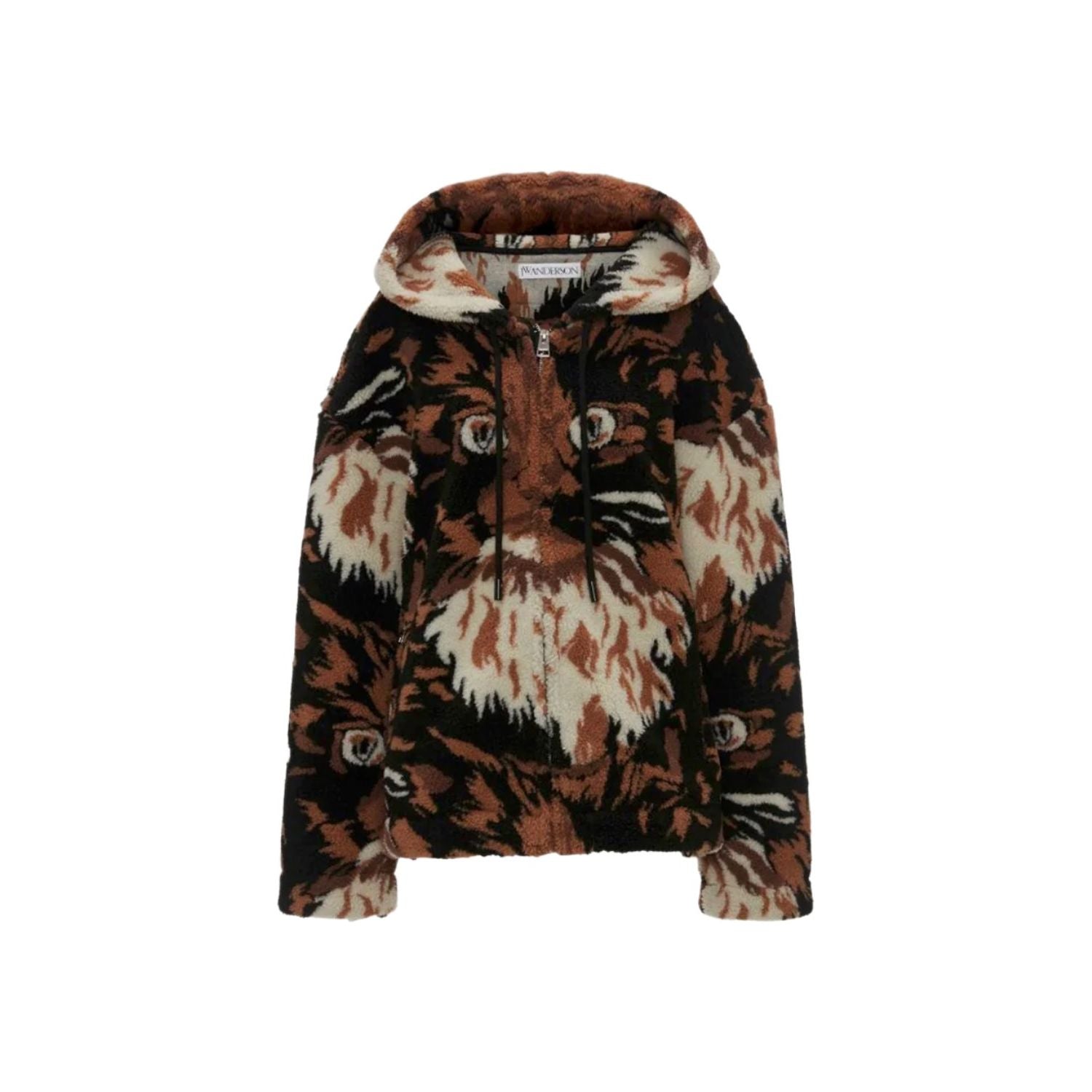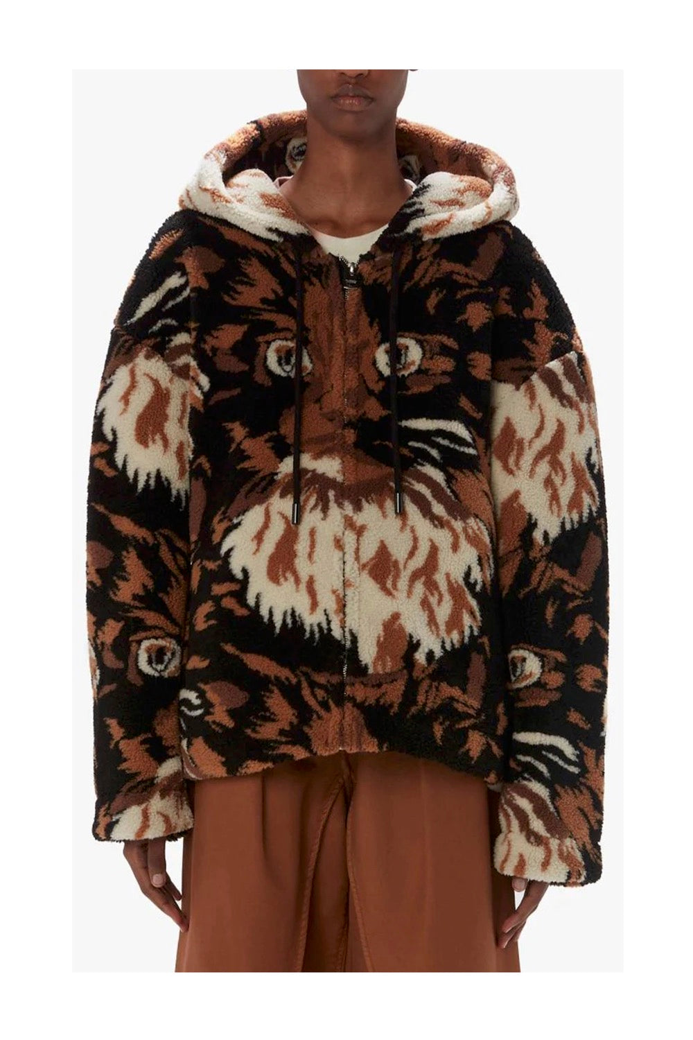지퍼 잠금 장치와 포인텔 플라워 프린트가 있는 플리스 후드 재킷입니다.