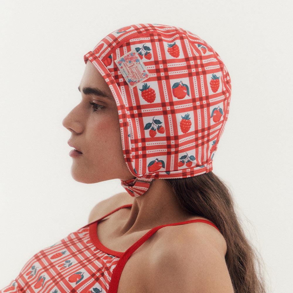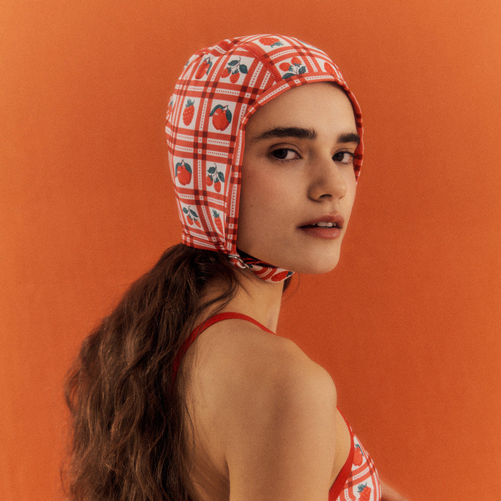 Retro-inspired aviator swim cap in a playful red strawberry table check pattern, combining vintage style with a fun twist.
