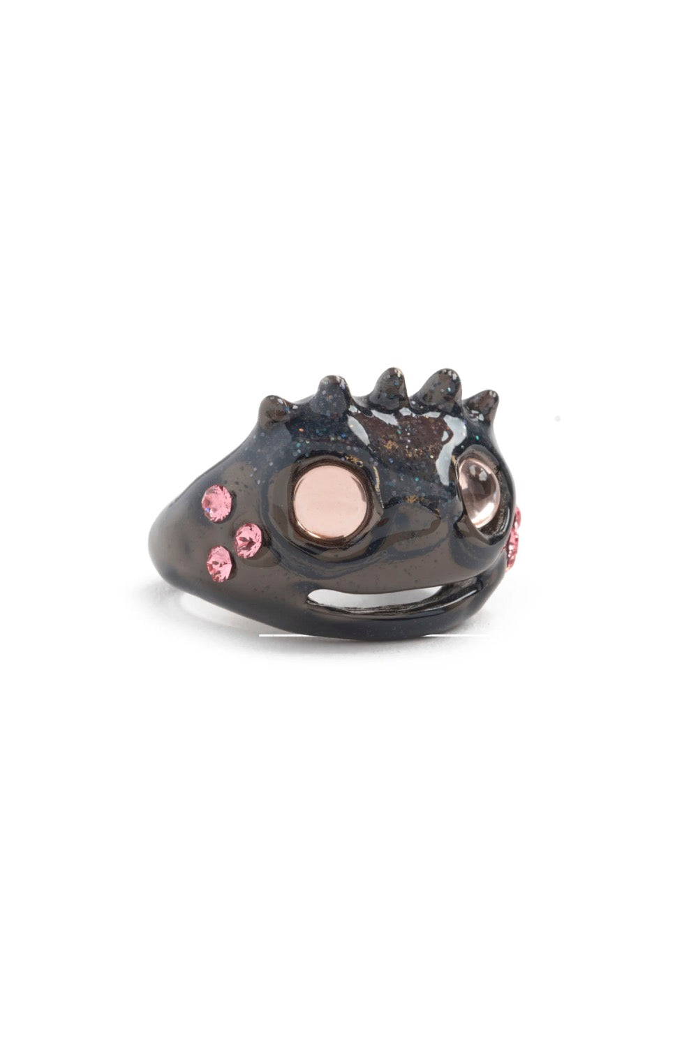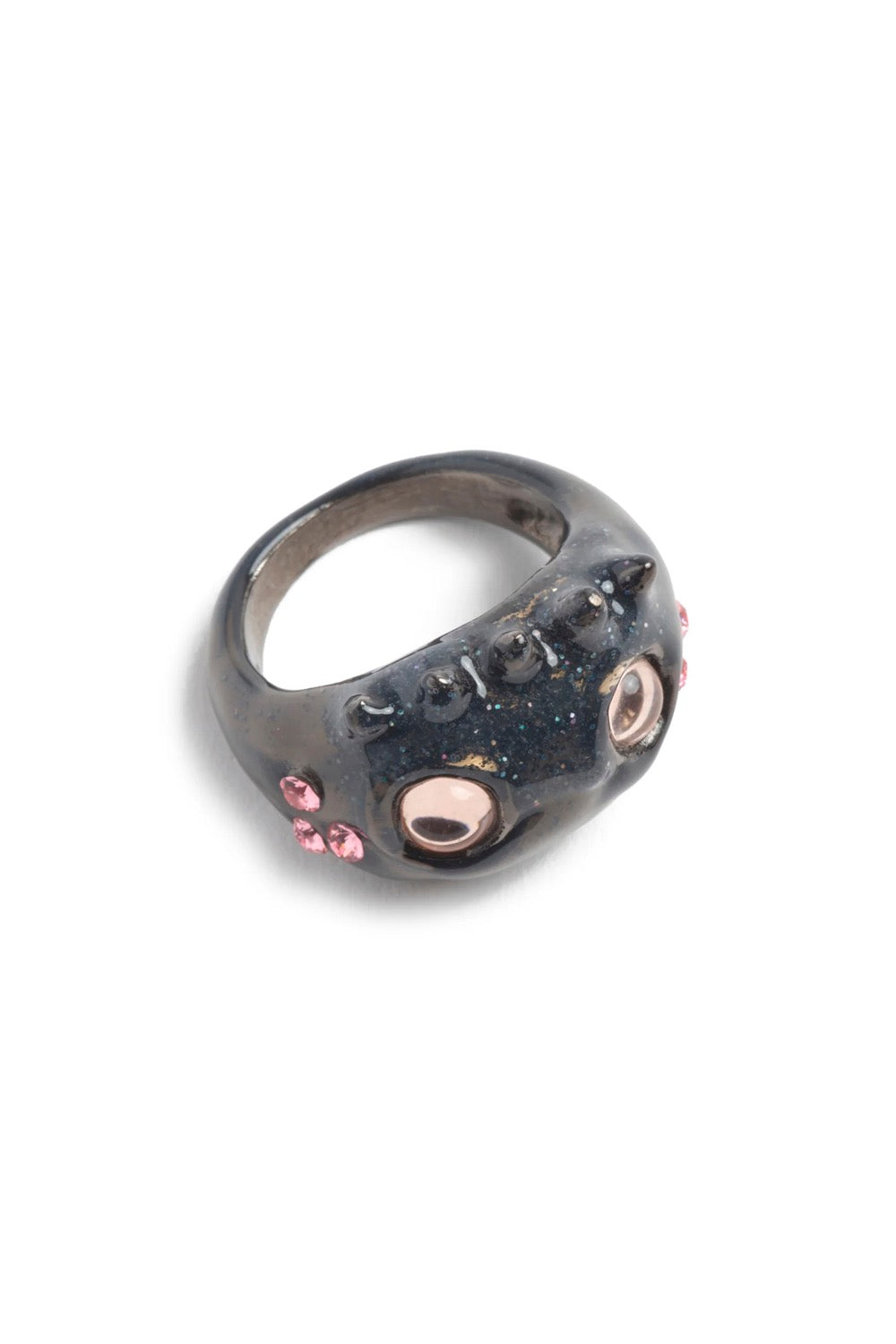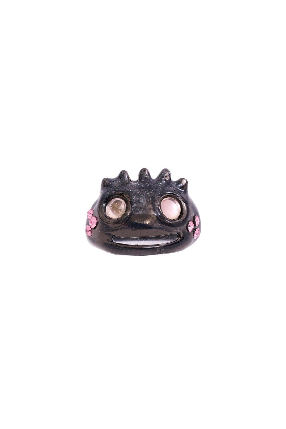 Black Glitter frog ring with glittery spiked crown, pink eyes, and pink freckles.