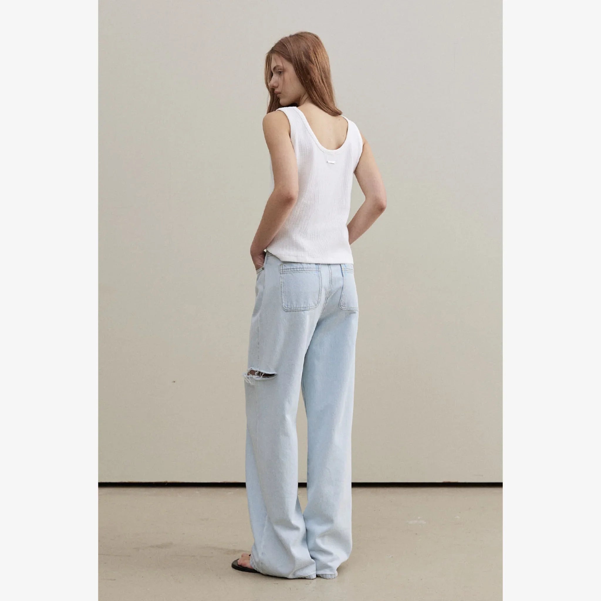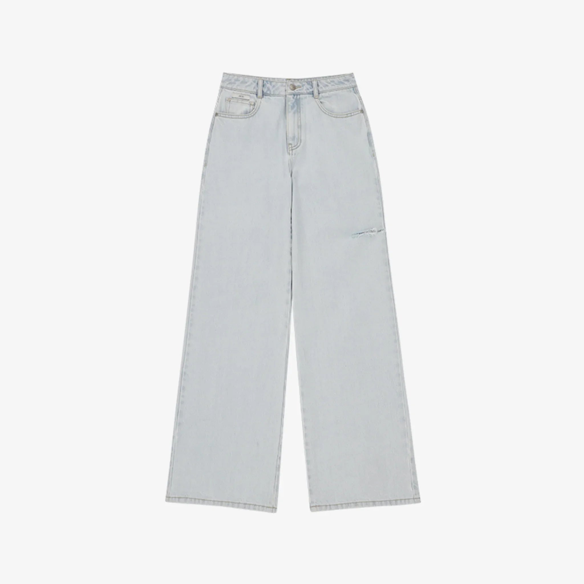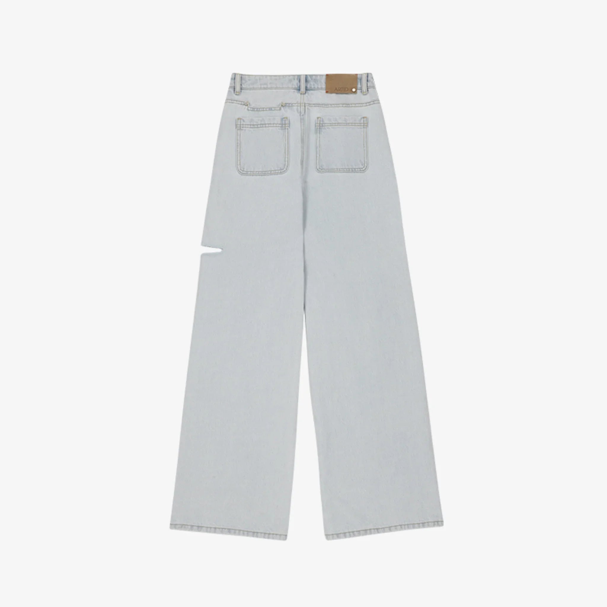 Leg slit wide denim pants designed for a relaxed yet modern silhouette, featuring side slits for subtle movement and style.