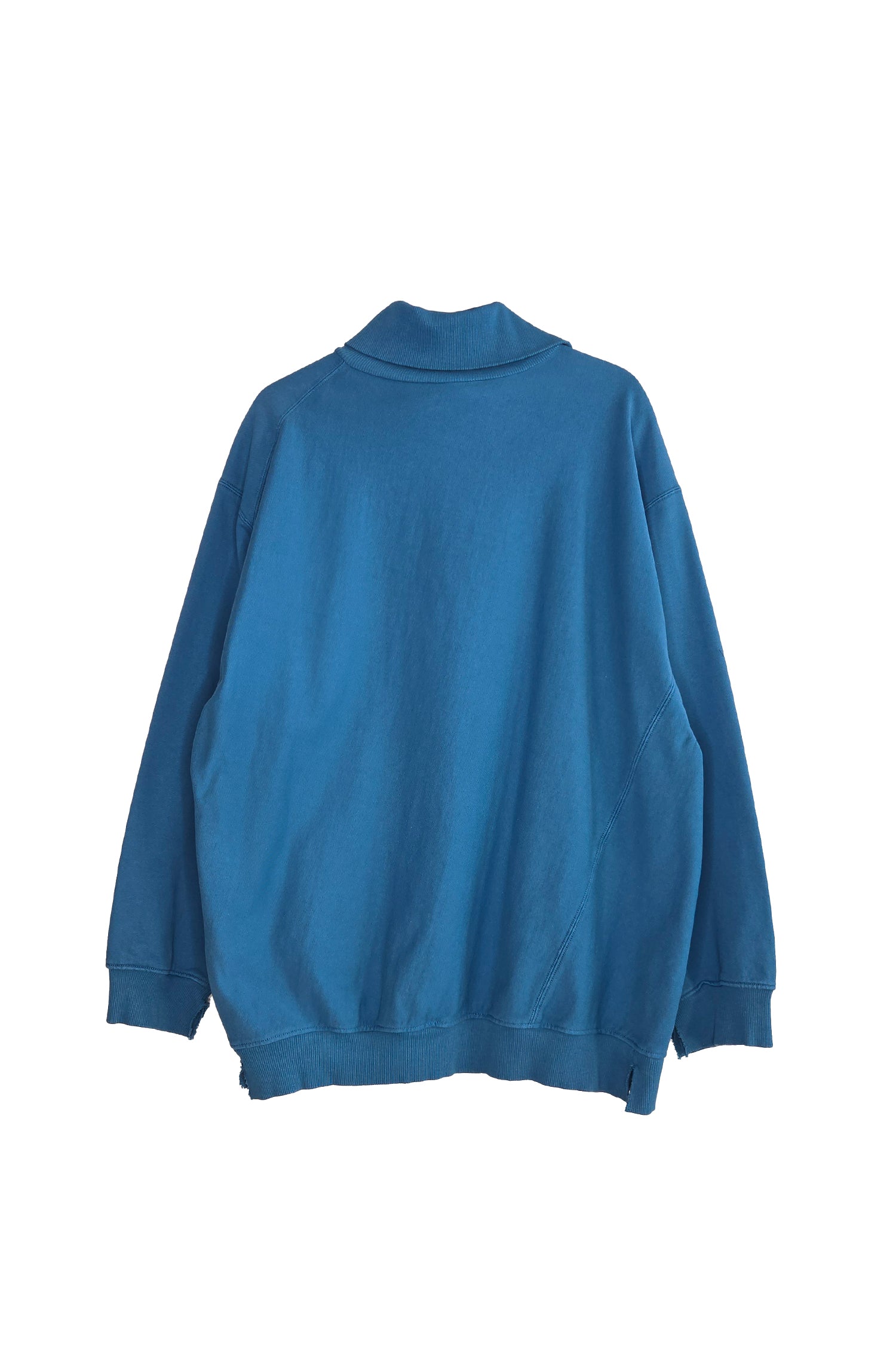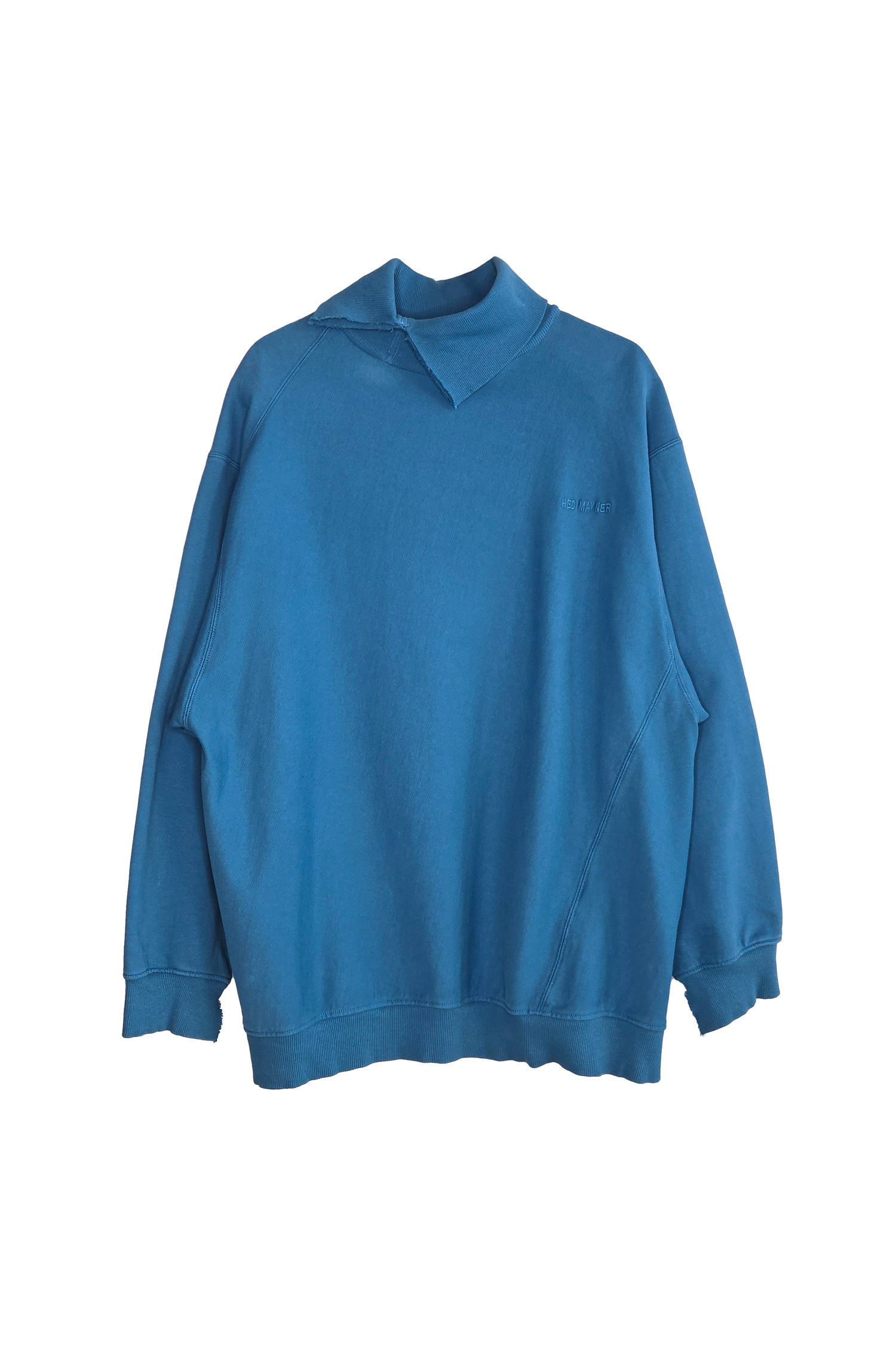 Men's blue foldover split-neck sweater with long sleeves and dropped shoulders.