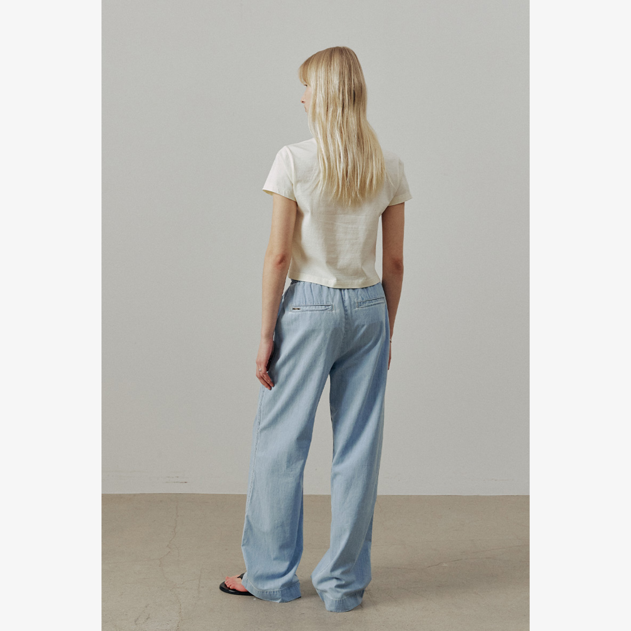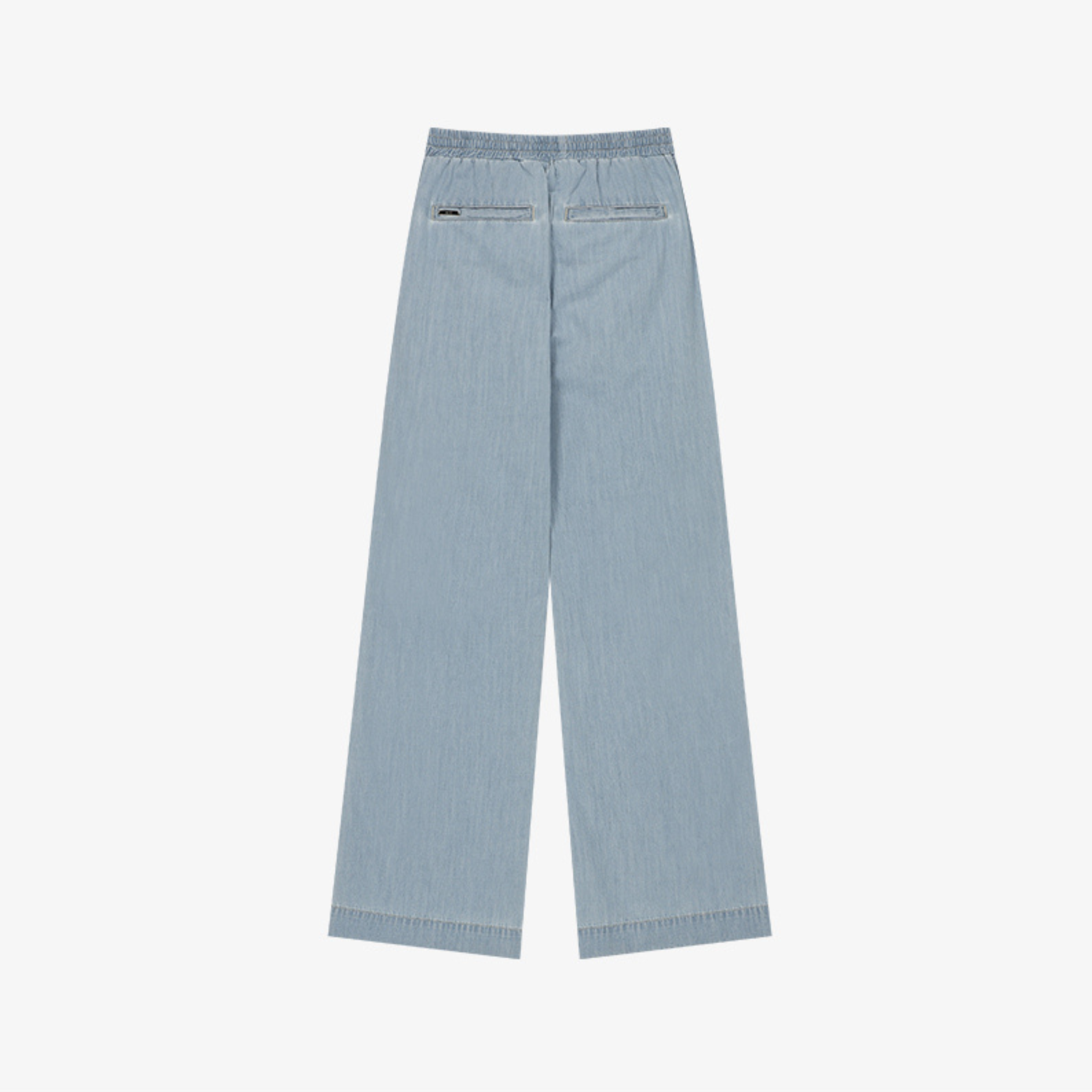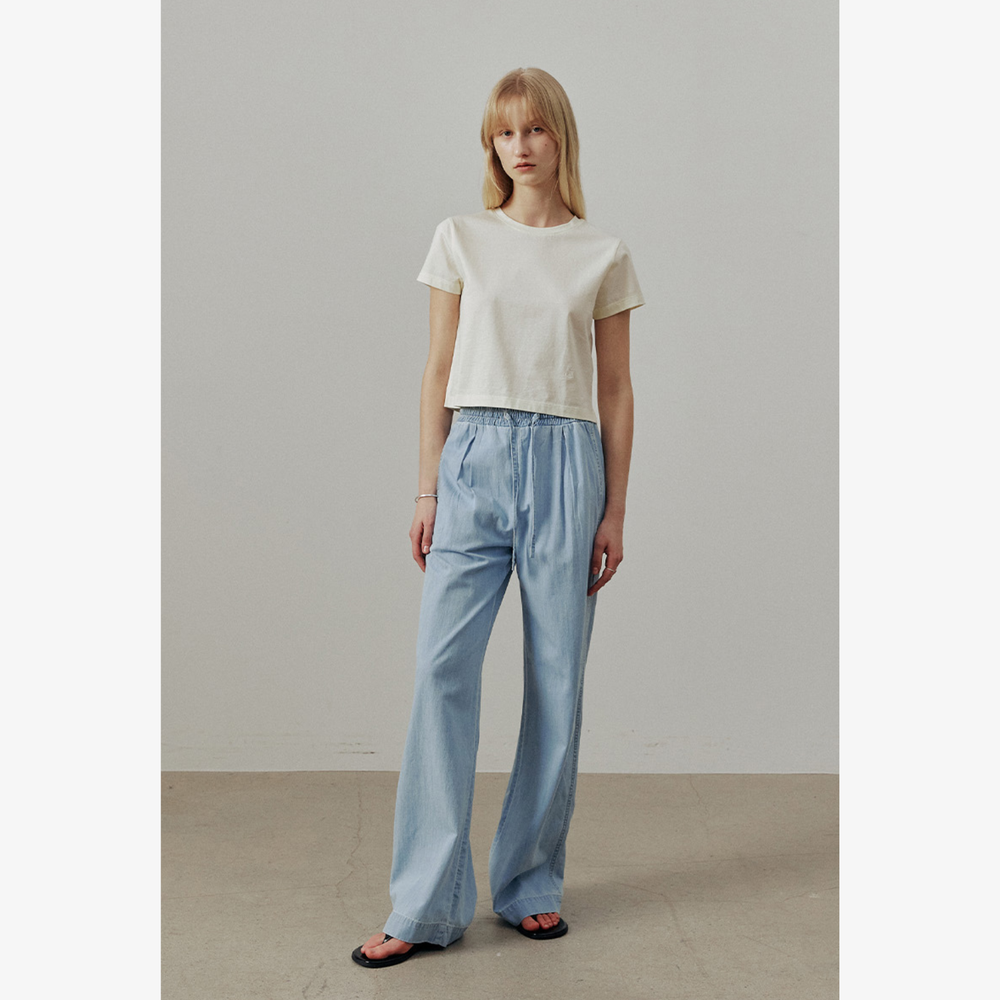 Light tuck denim pants designed with a relaxed semi-wide silhouette for easy summer wear. Made from lightweight cotton denim, offering comfort and breathability for everyday styling.