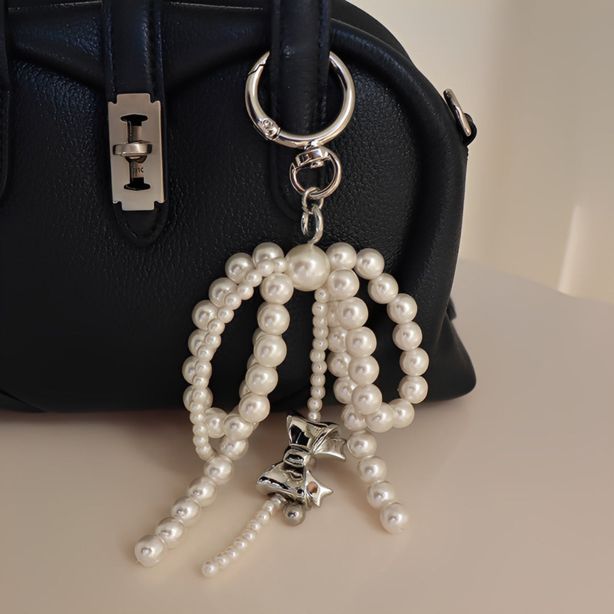 Pearl and metal ribbons combined to create a refined accent for bags, denim, keys, shoes, and beyond.