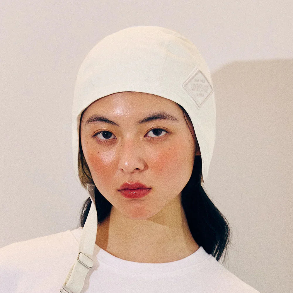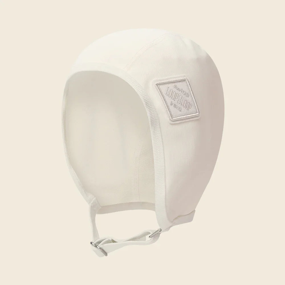 Retro-inspired aviator swim cap in ivory, designed with a clean silhouette for timeless styling.