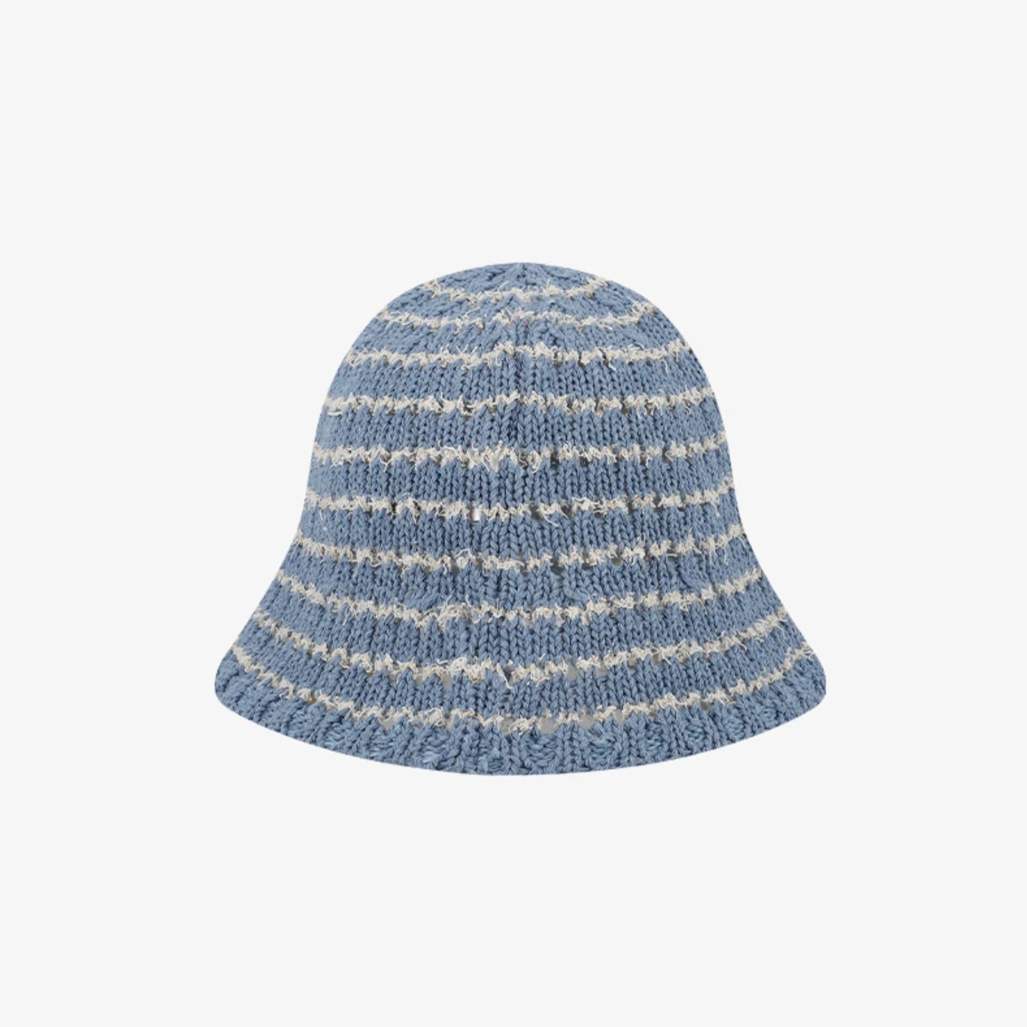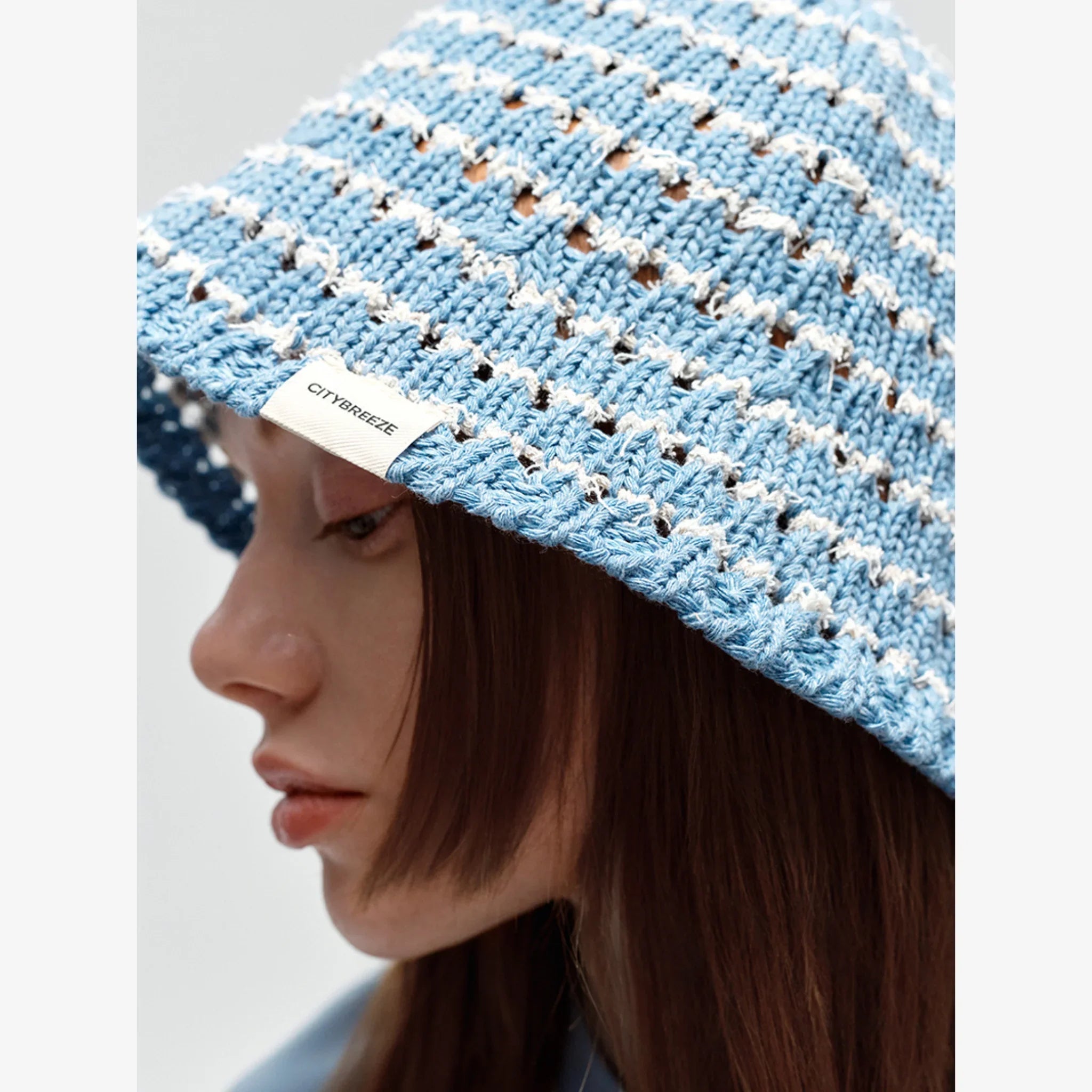 Color block crochet bucket hat featuring a striped pattern crafted from contrasting yarns. Offers a unique look with a naturally draped fit for comfortable wear.