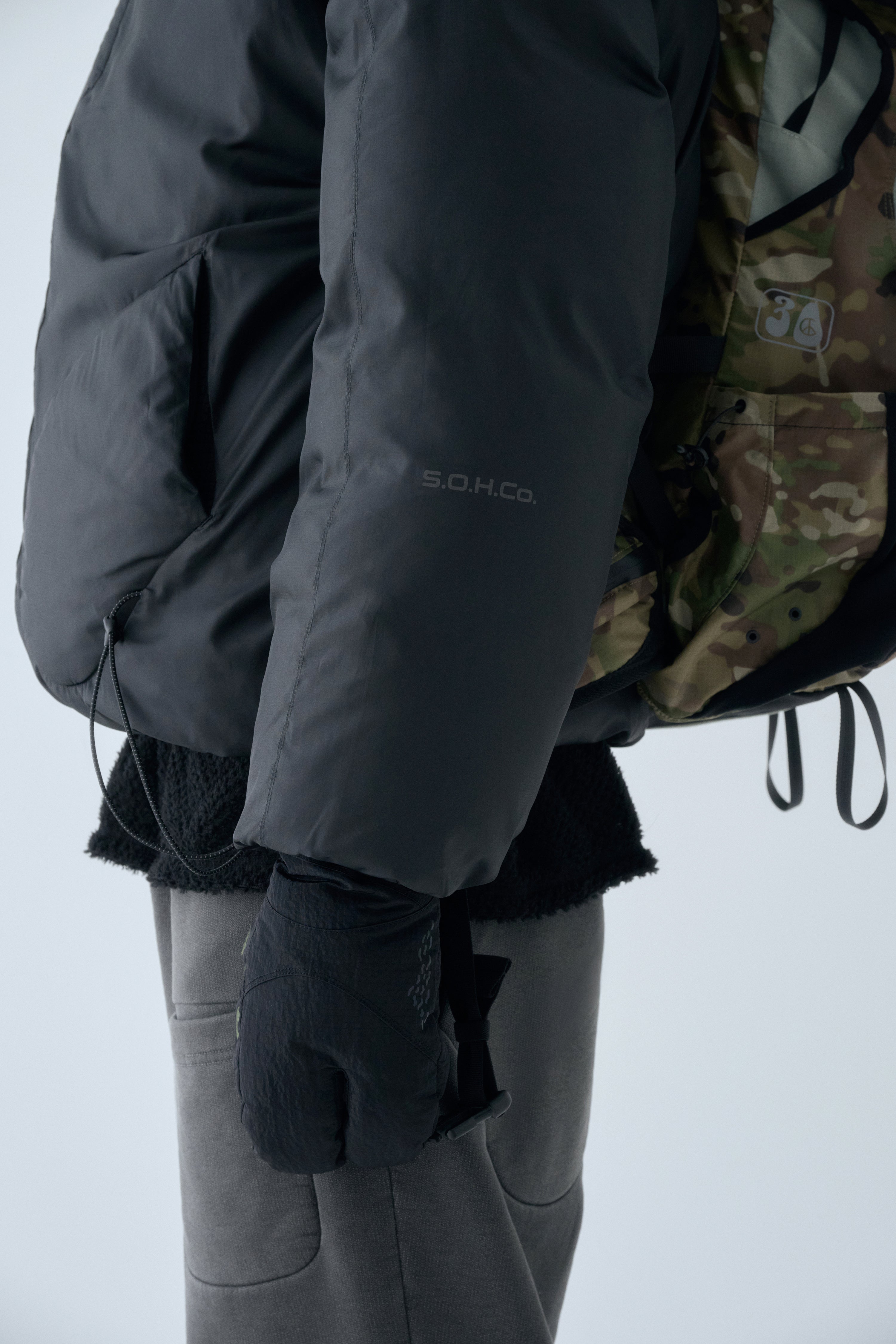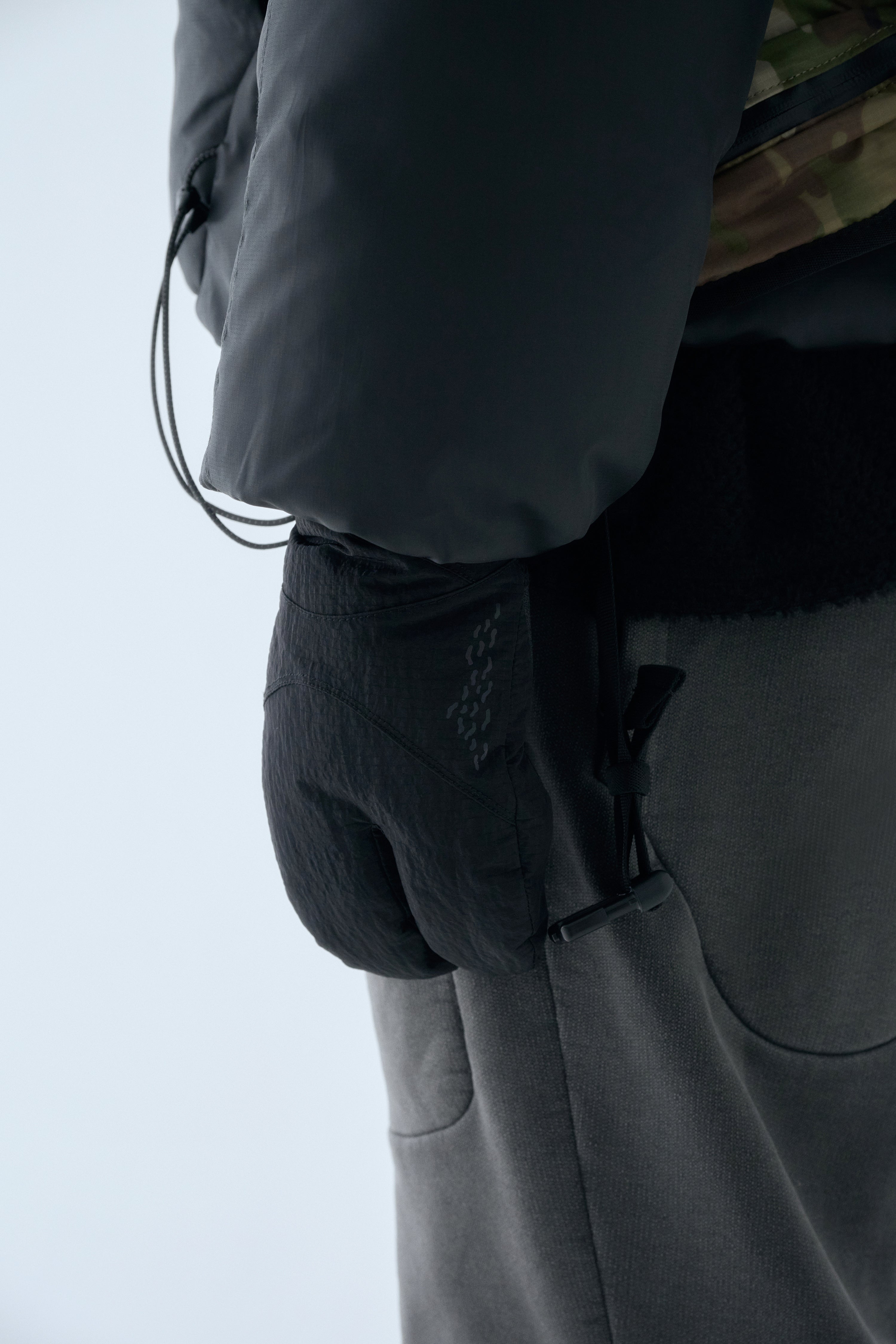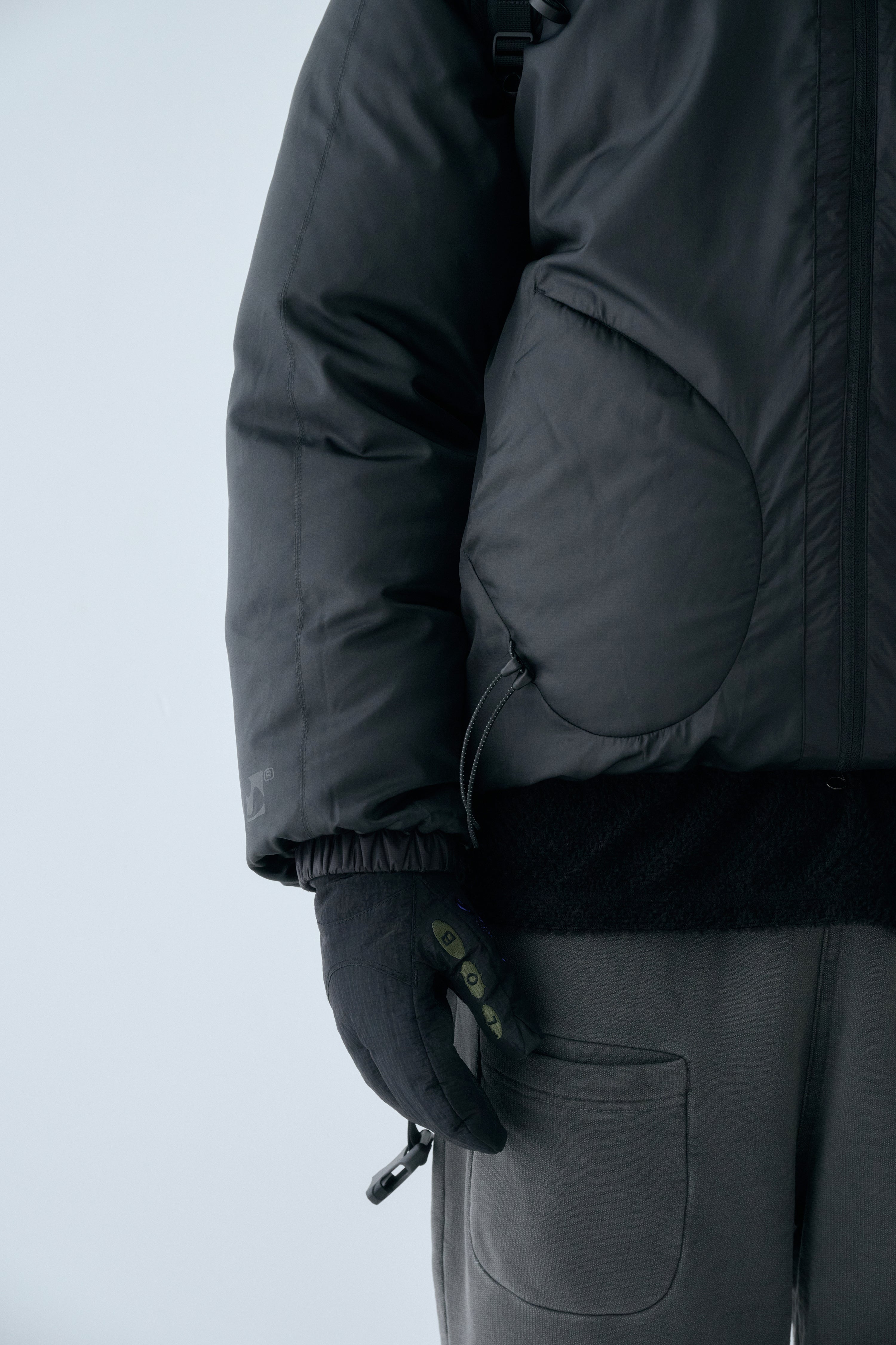 Crafted from high-density nylon, this piece features elastic cord details at the wrists for secure fit and is finished with seasonal concept embroidery and print.