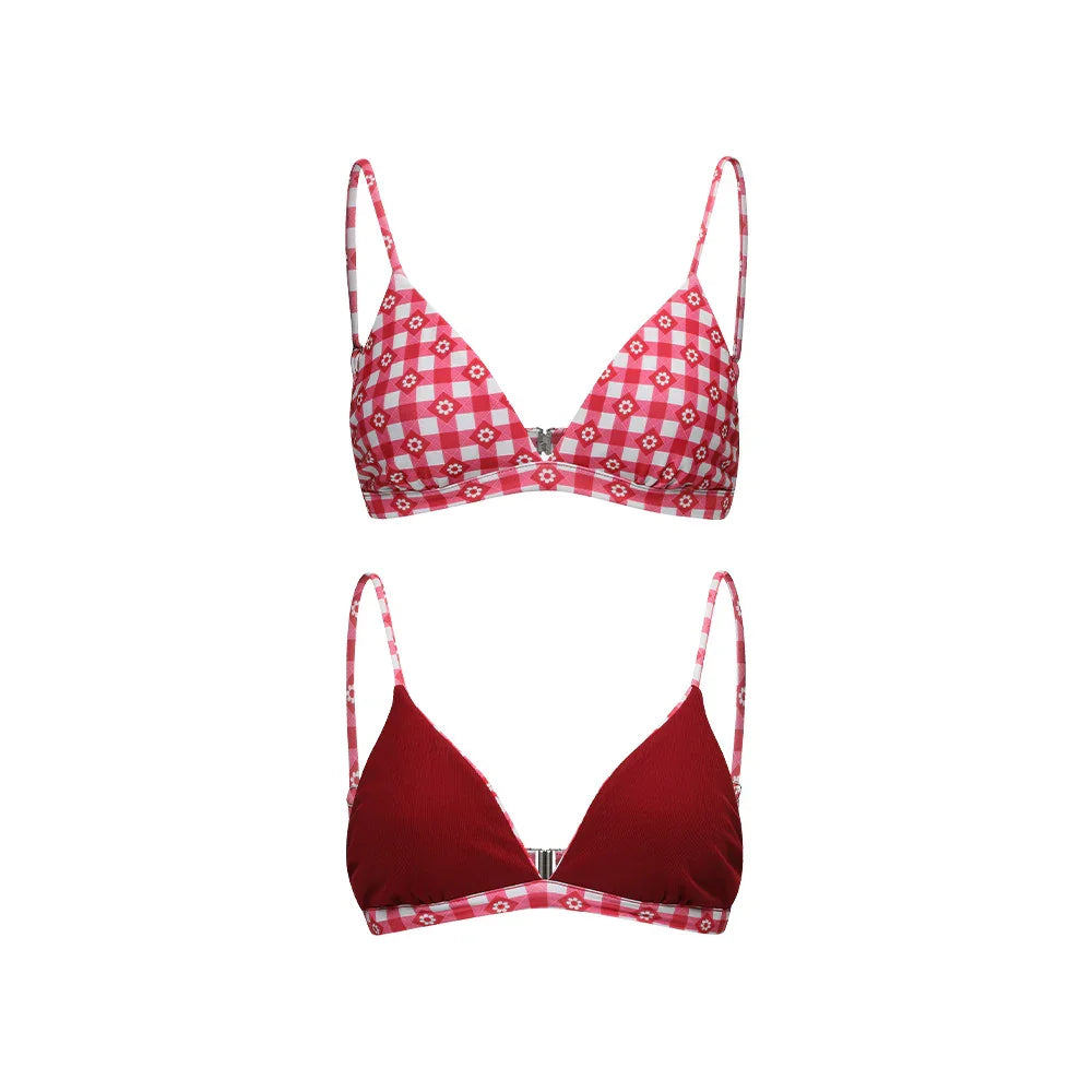 Triangle reversible bikini top in a charming gingham cottage red, offering two looks in one for versatile beach style.