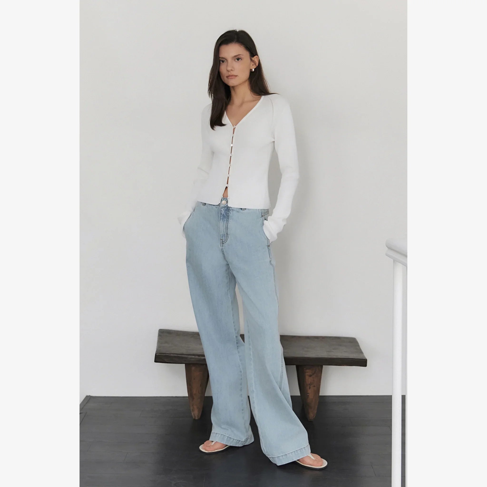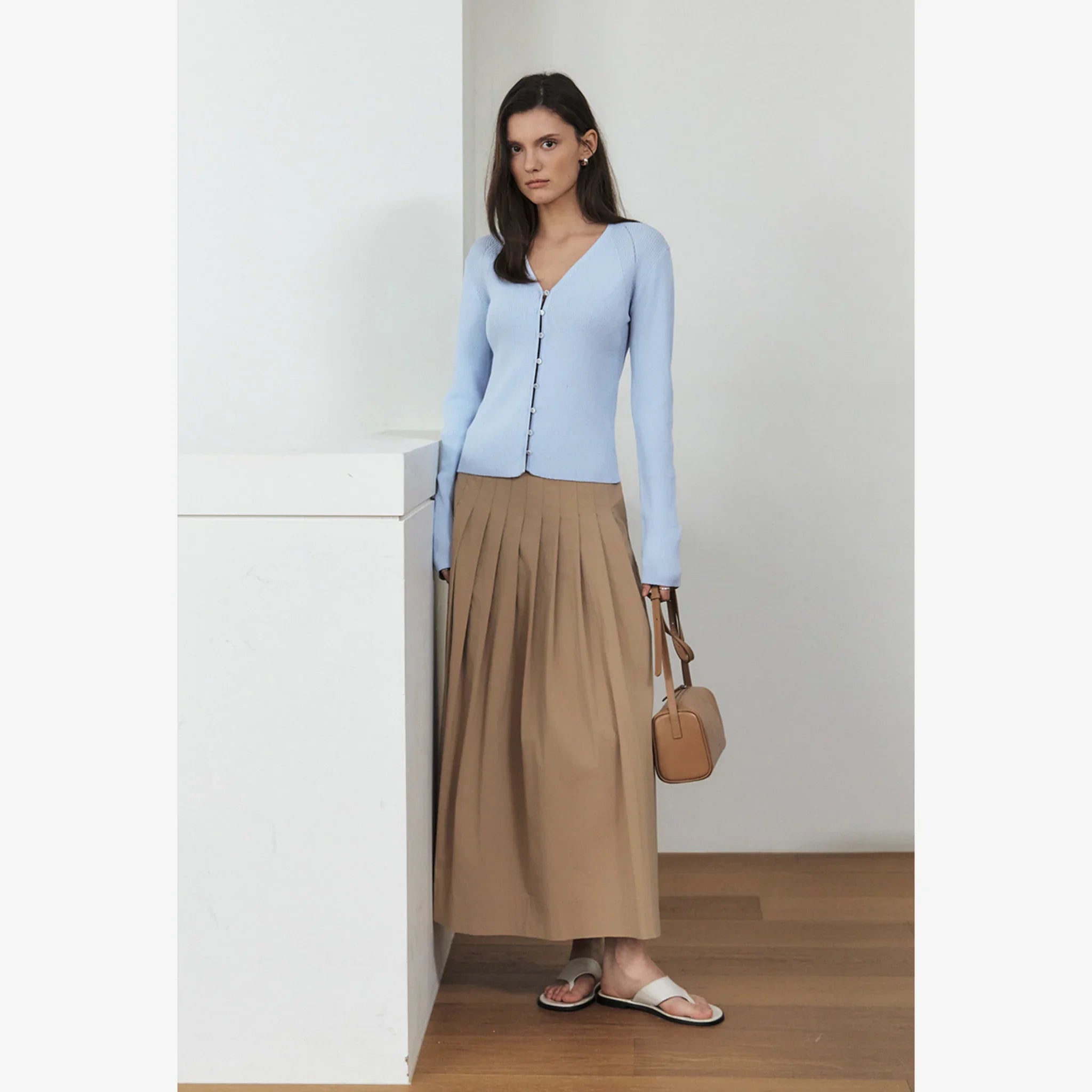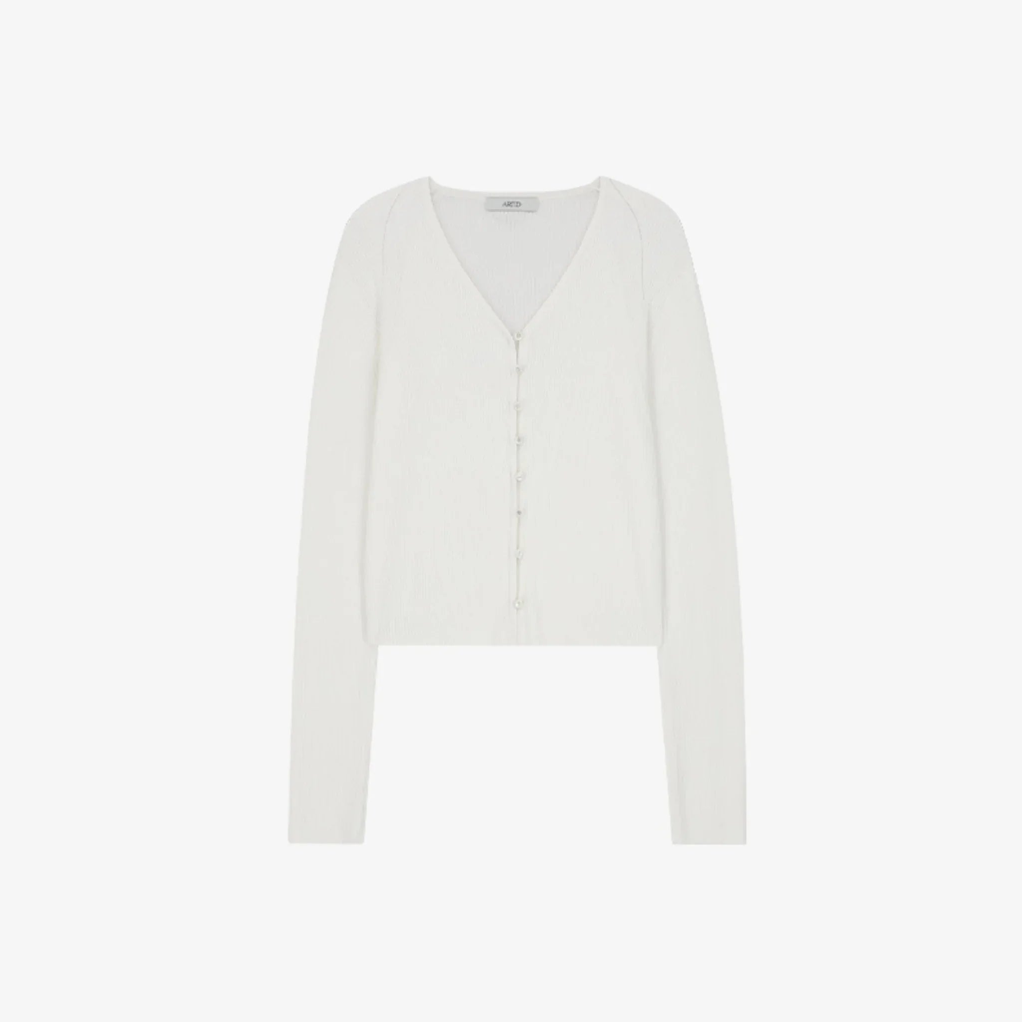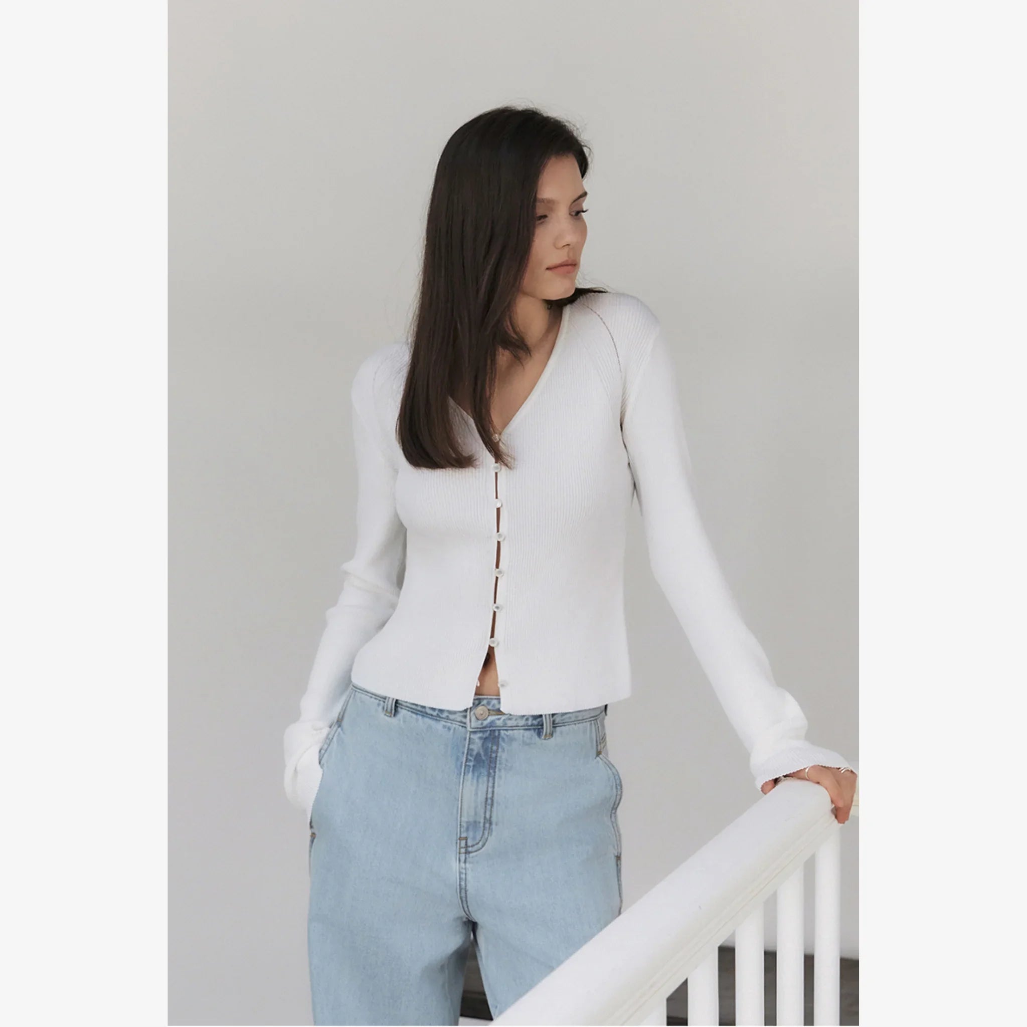 Lightweight cardigan with a refined V-neckline and delicate thread buttons, perfect for layering over seasonal outfits.